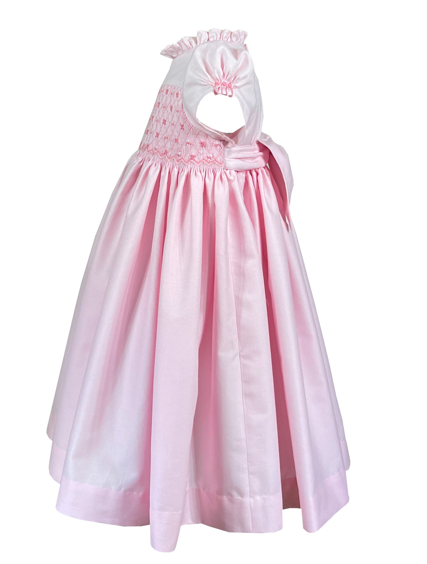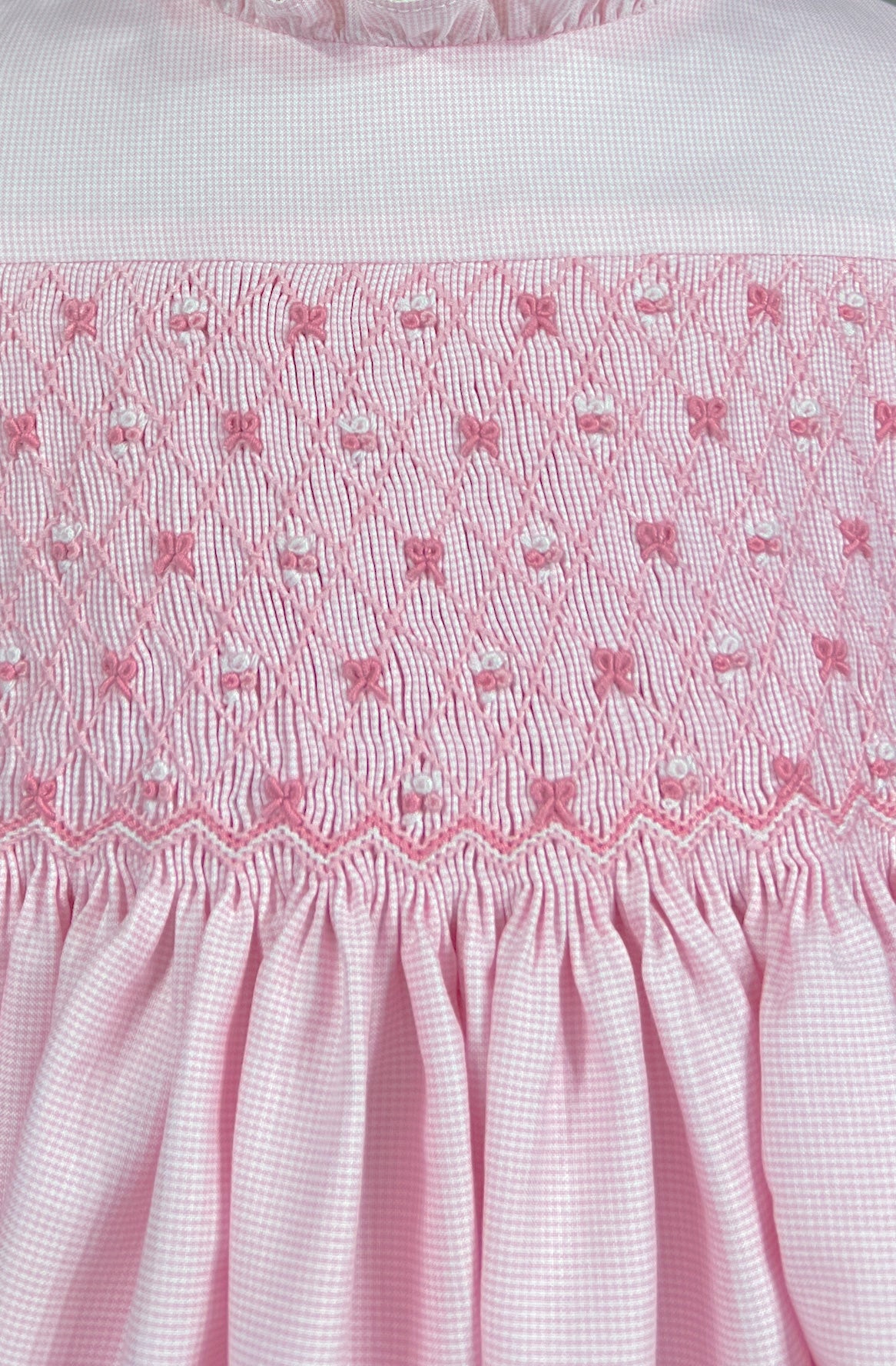 The bodice showcases exquisite hand smocking adorned with miniature embroidered bows and rosebud in coordinating tones, each one meticulously stitched to create a garden of ribbons across the chest. These add dimensional texture and whimsical charm to the classic smocked silhouette.