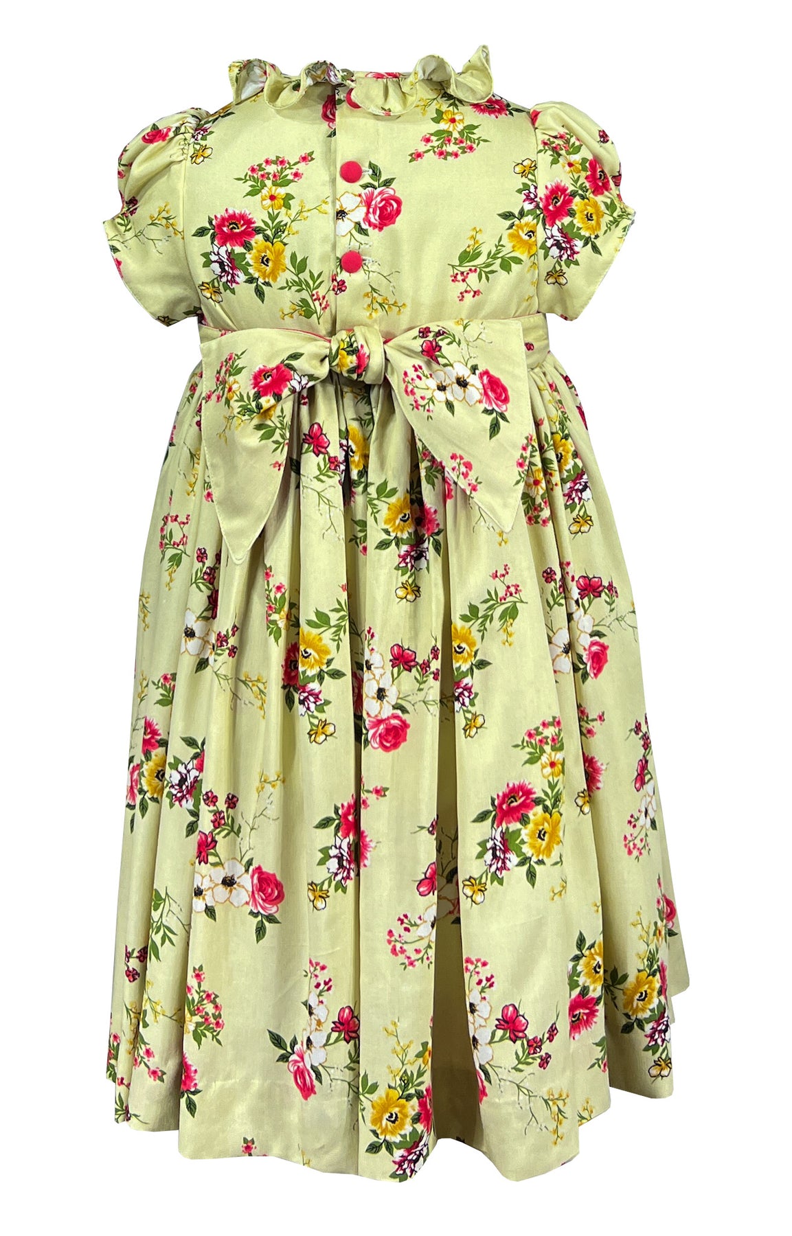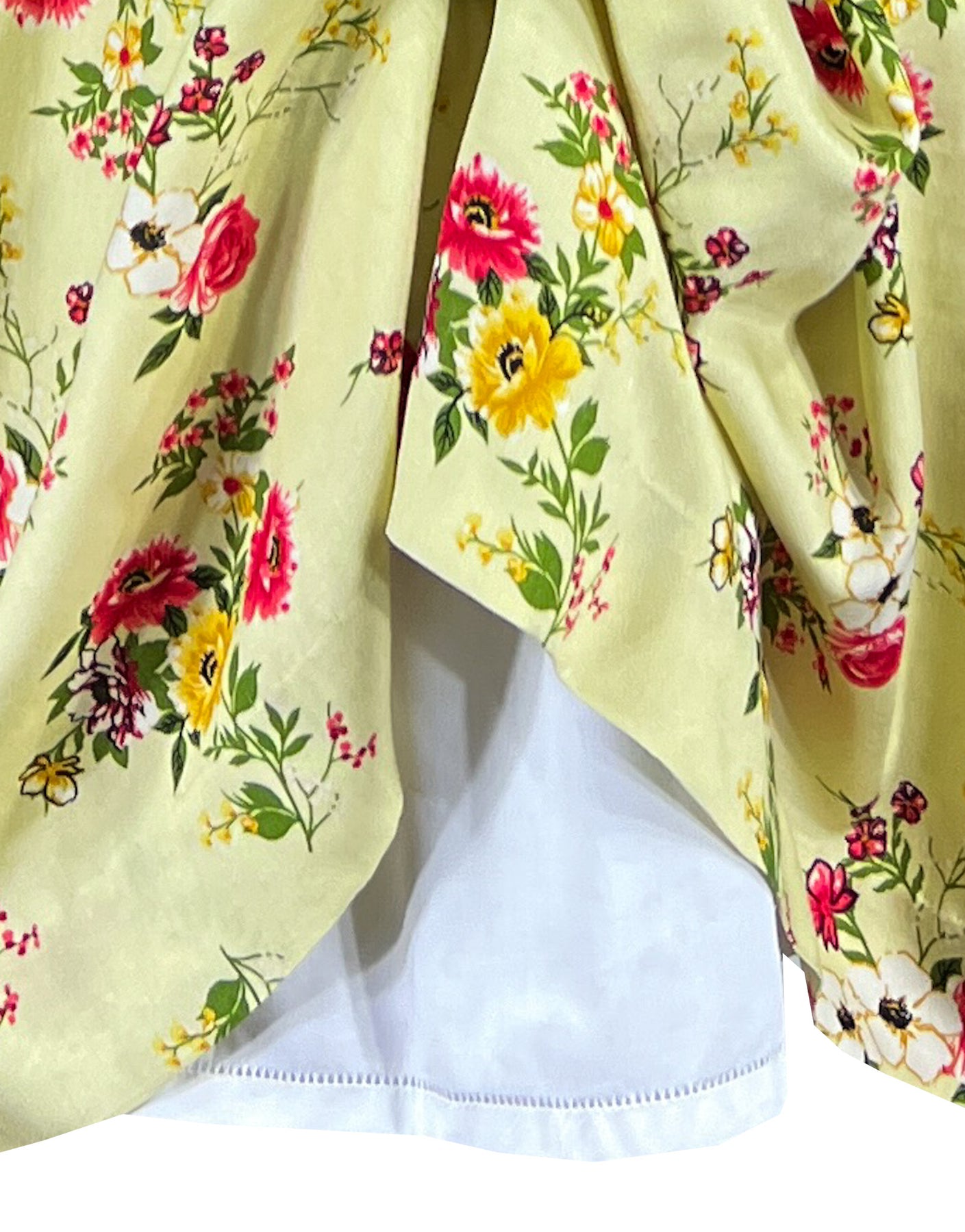 The flowing skirt cascades in gentle pleats, scattered with the same enchanting floral motifs that bloom across the bodice. The back features self-covered buttons and our signature butterfly bow sash.