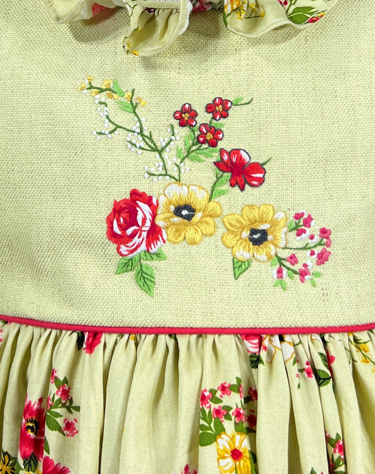 The beige bodice features a stunning bouquet of hand-embroidered flowers where crimson roses dance alongside golden Gloriosa daisies and tiny sprigs. Each petal is lovingly stitched creating a three-dimensional garden that seems to flutter with life.