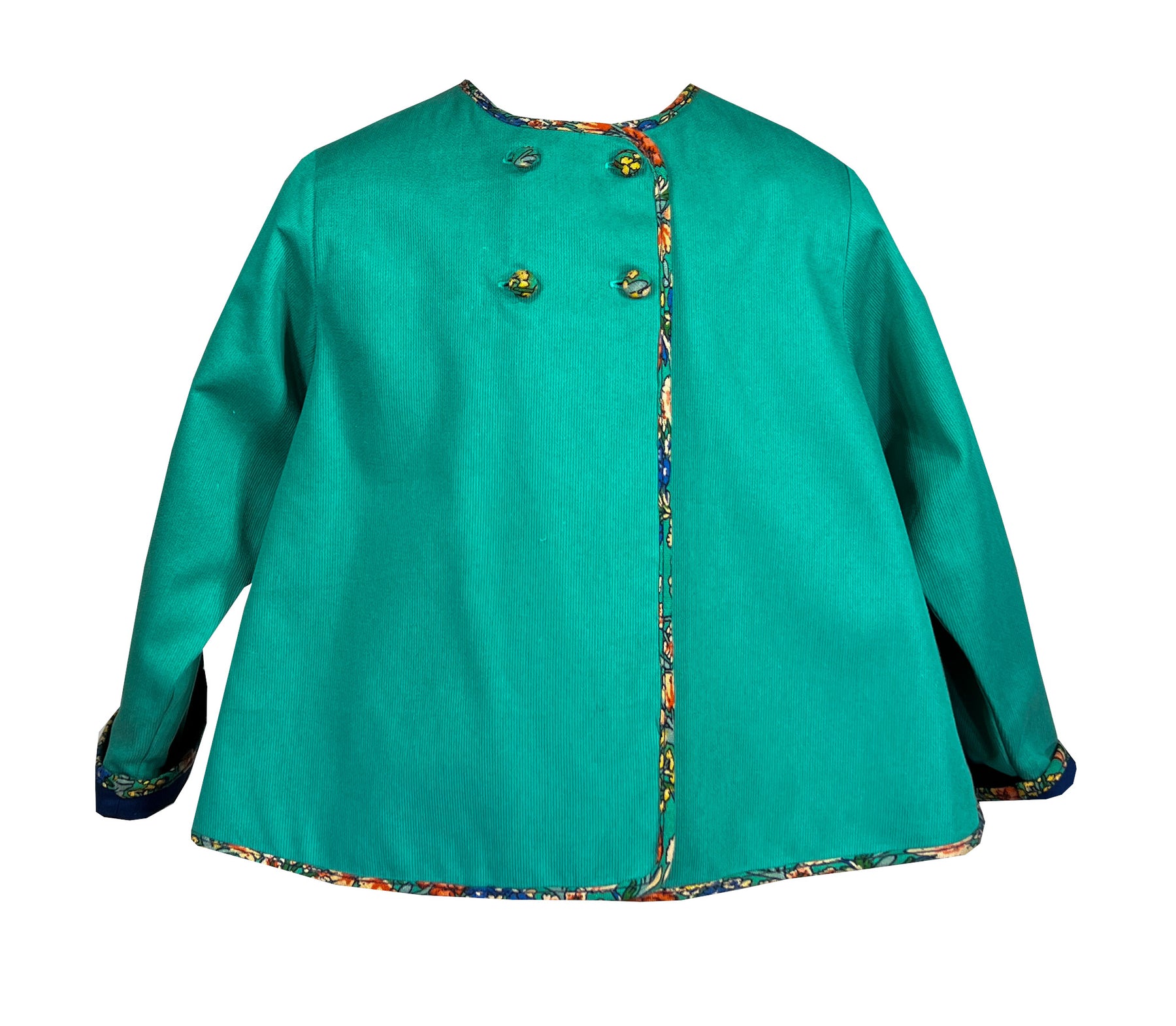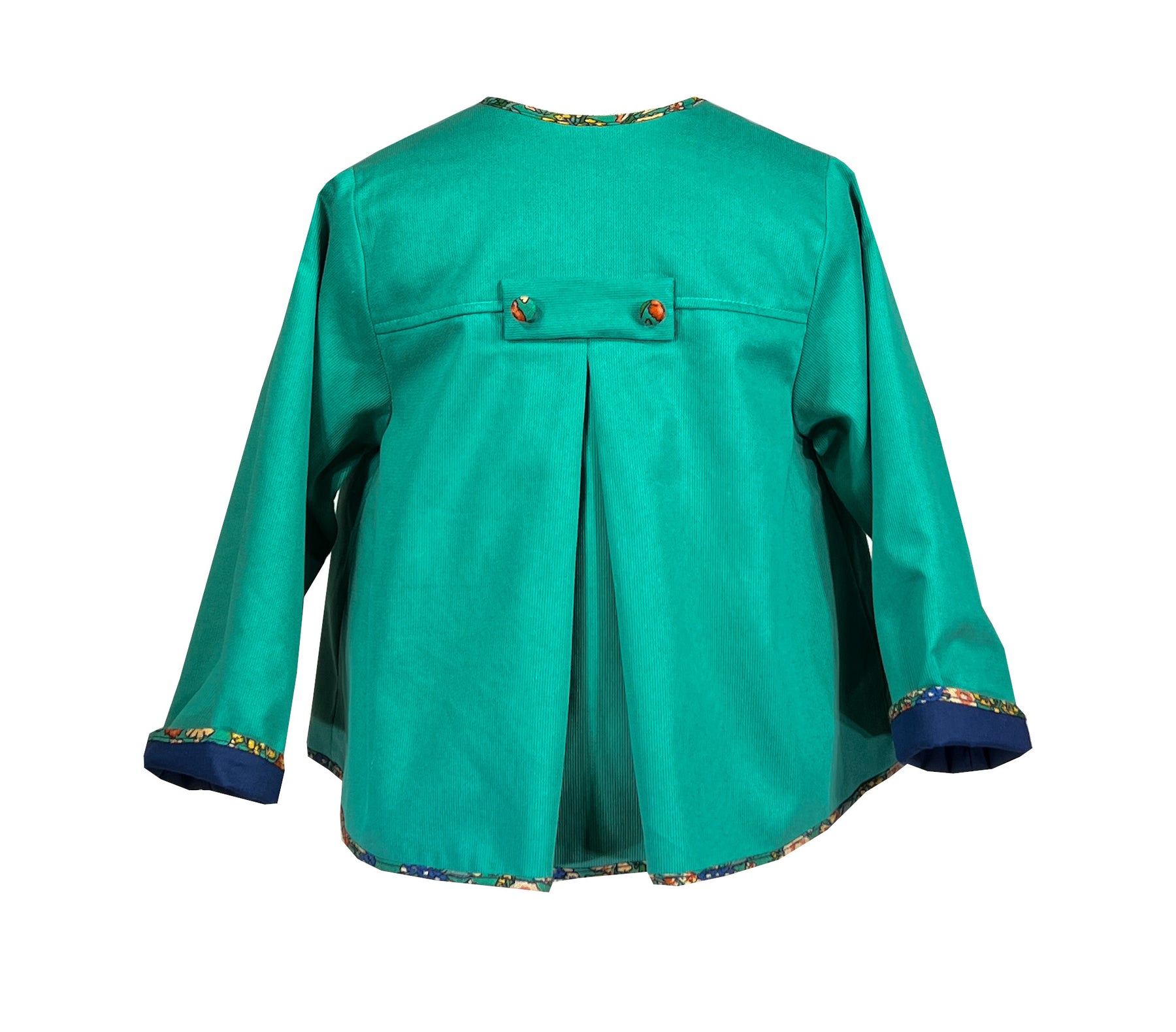 This specific vibrant green one cut from ribbed cotton piqué catches the light with luxurious depth. Its relaxed silhouette features wide sleeves and an open front design, fully lined in coordinating navy fabric. It is meticulously finished with floral print bias binding at the collar, cuffs, and hemline.