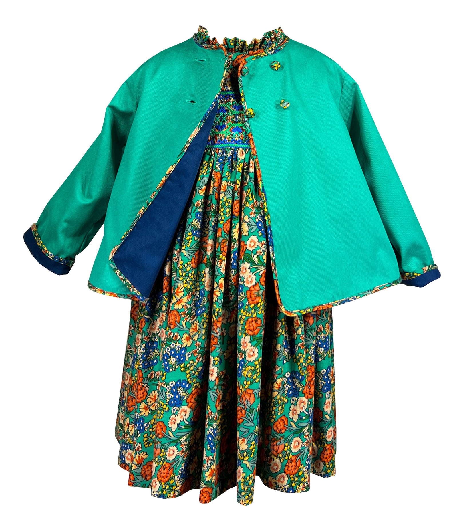 Van Gogh understood that color could express pure emotion and joy. The coat is our contemporary interpretation of his artistic vision, a way to frame the floral abundance of the coordinated dress like a gallery wall frames a masterpiece.