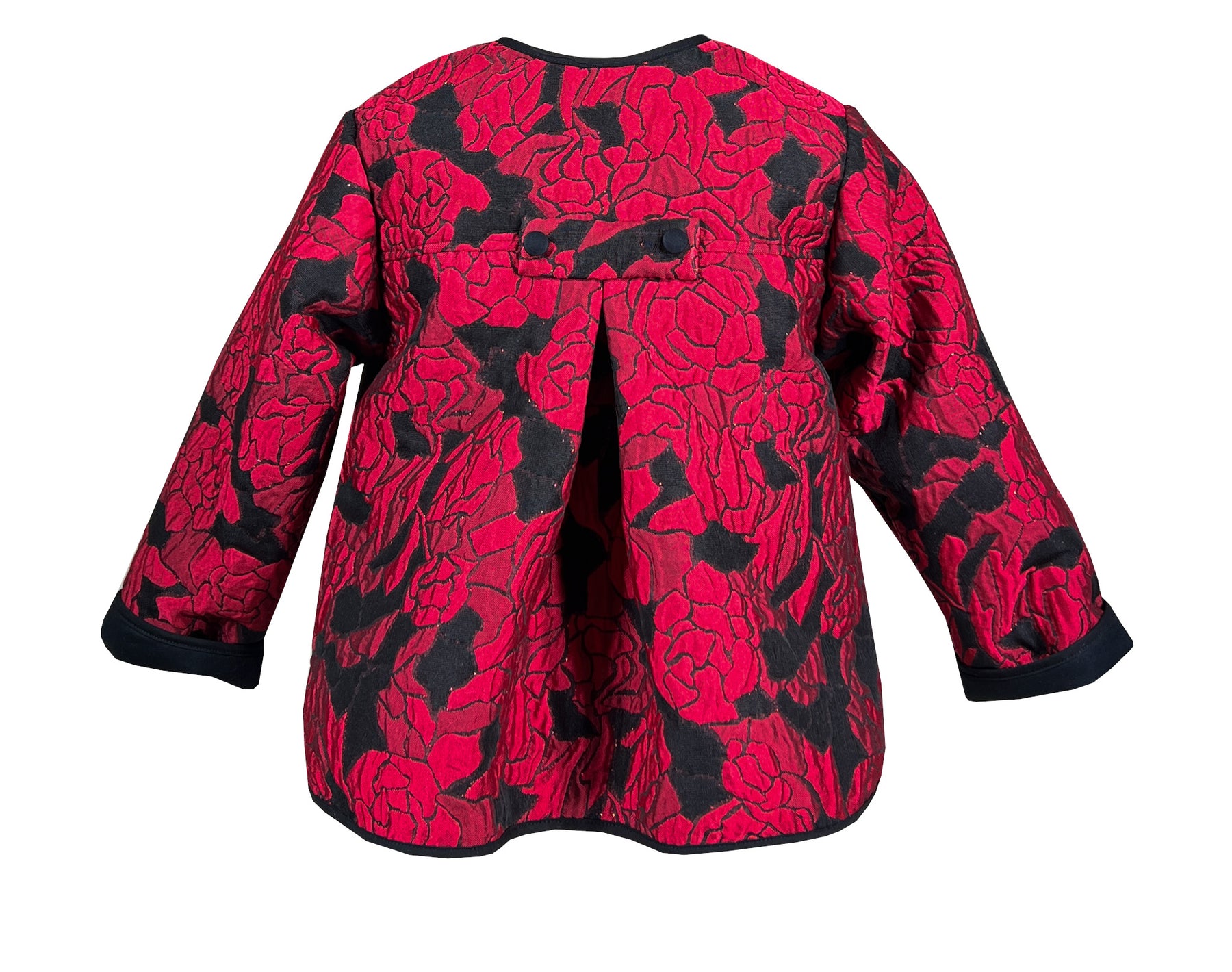 A statement of theatrical elegance, the Rose Royale jacket transforms outerwear into art. Bold crimson roses bloom in luxurious relief against a deep black background, creating a sophisticated floral tapestry that captures attention and admiration. The quilted jacquard fabric features raised rose patterns that add beautiful dimension and texture. Its subtle glittery threads add a discreet glow.