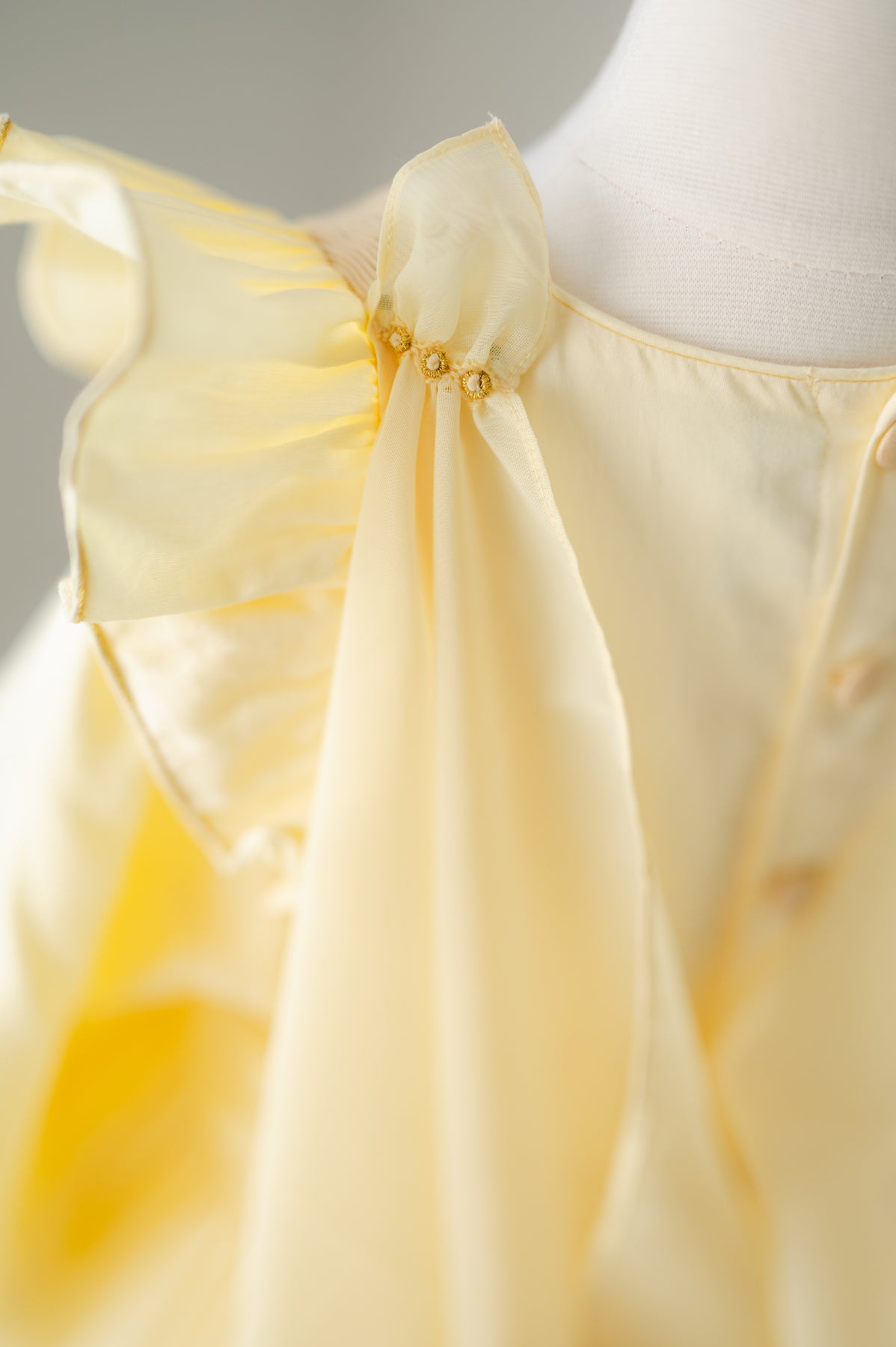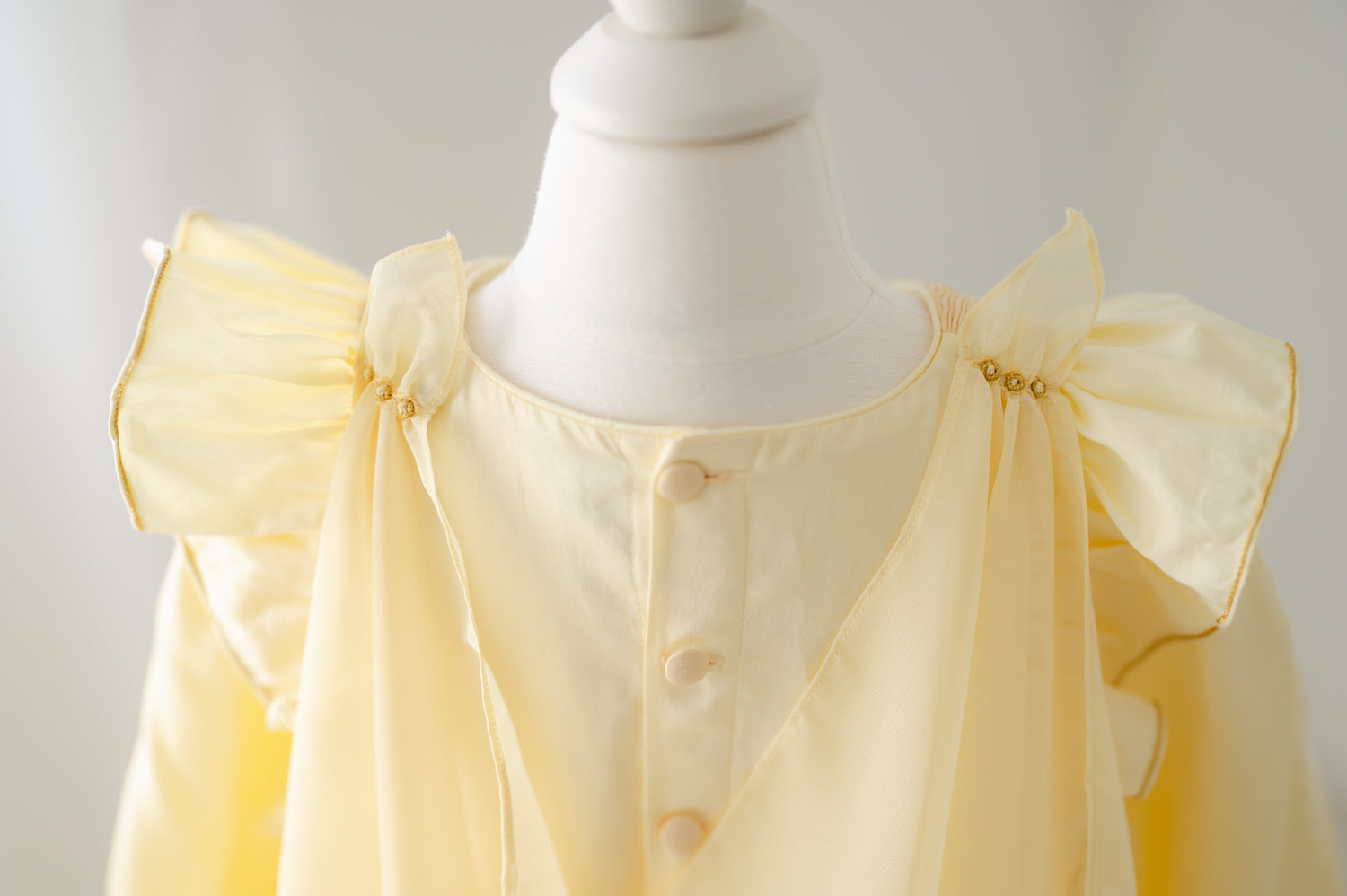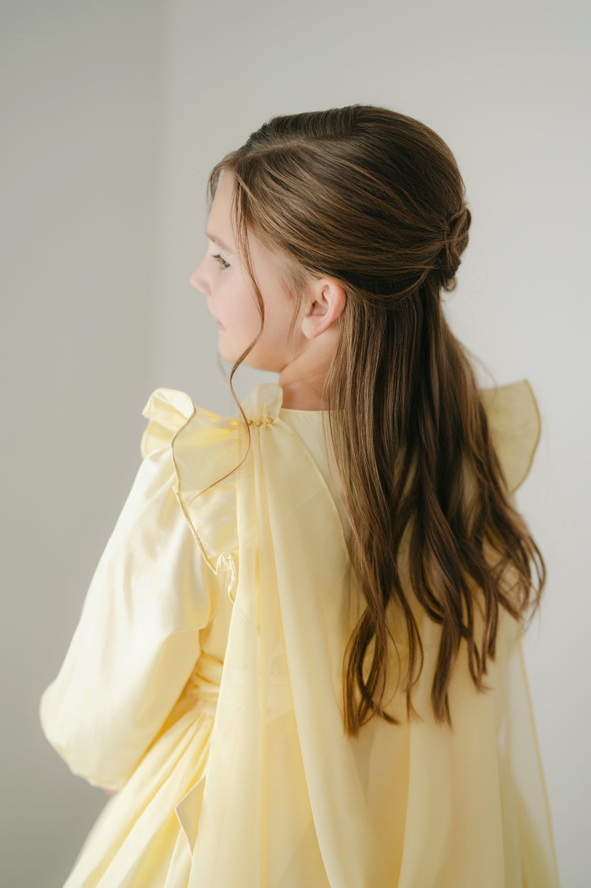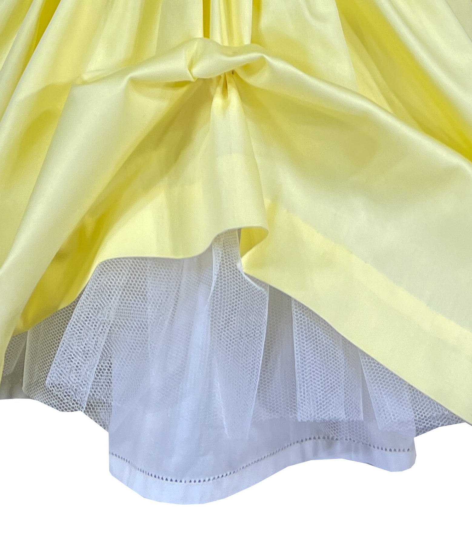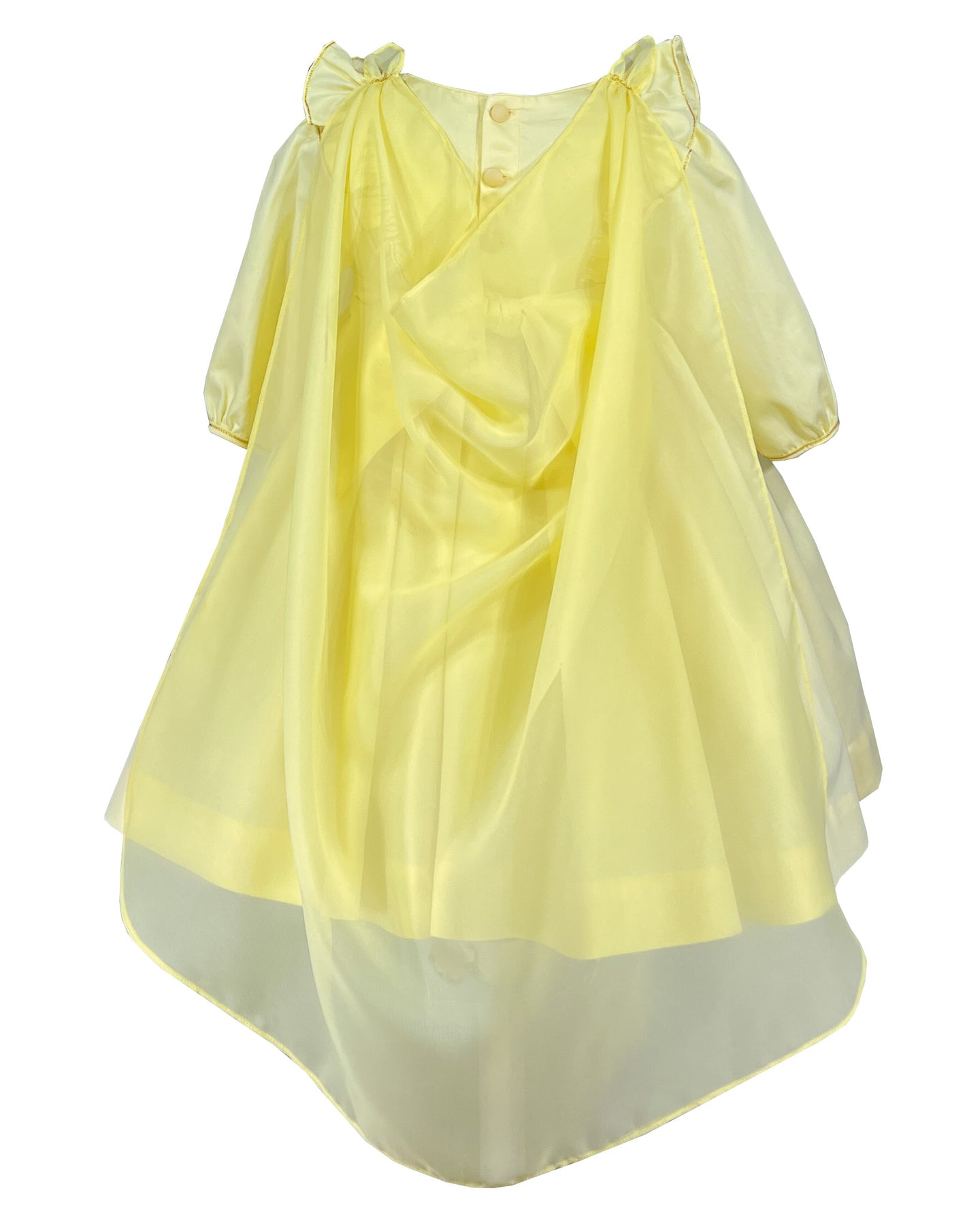 Lovingly crafted in the richest golden yellow satin cotton, this dress captures the very essence of Belle's iconic ballgown. The luxurious fabric catches the light with every movement, creating a luminous glow that mirrors the dancing candlesticks from the beloved fairy tale. The premium fabric ensures both comfort and elegance.