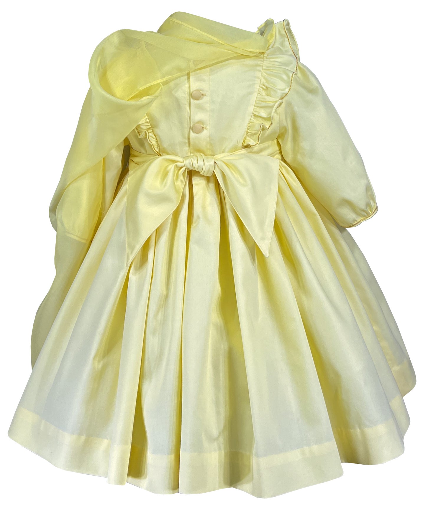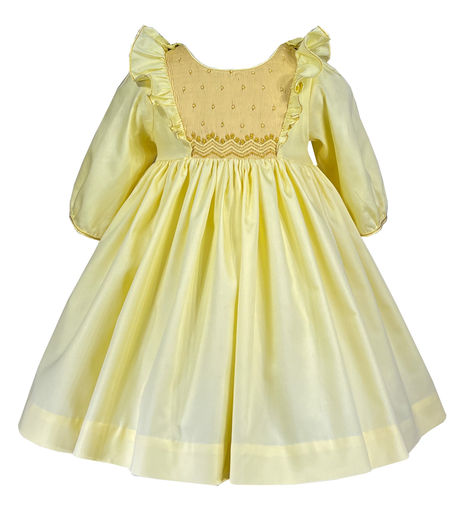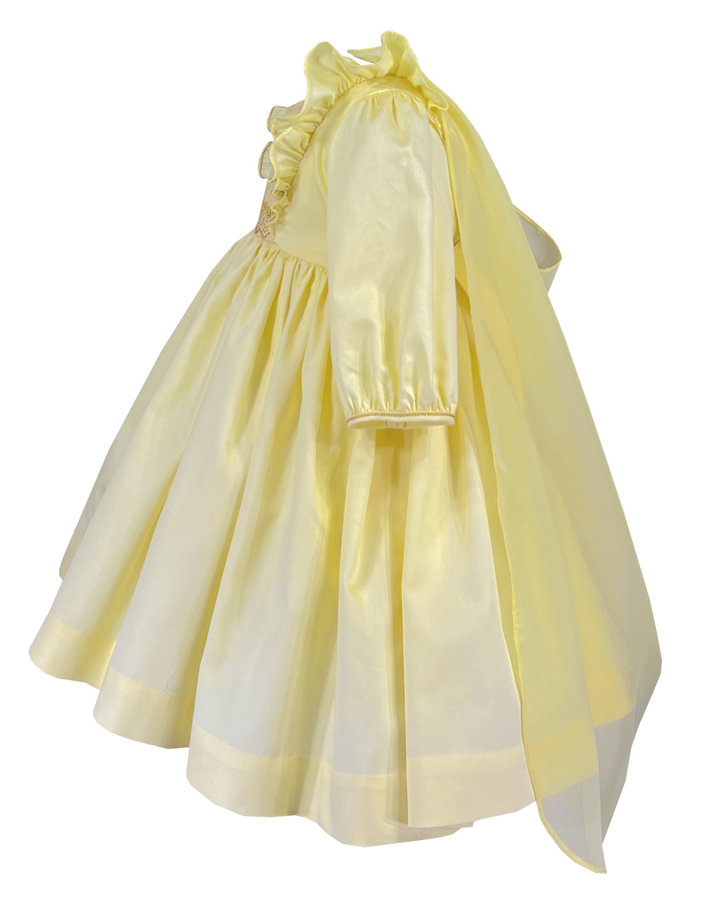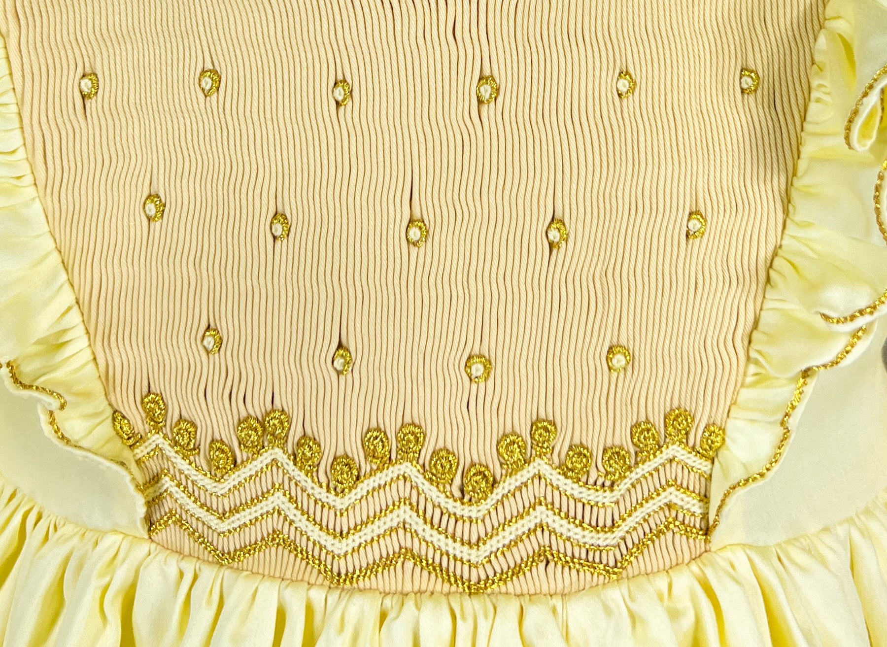 The exquisite hand-smocked bodice showcases the finest traditional needlework, where golden threads create intricate jewel like patterns that seem to shimmer with their own magic. The smocking creates beautiful texture and dimension.