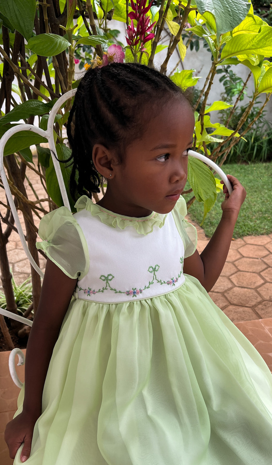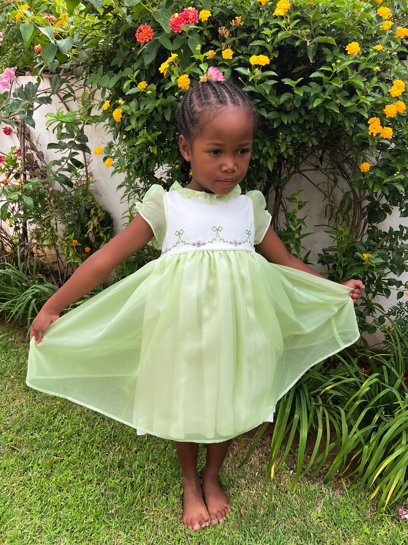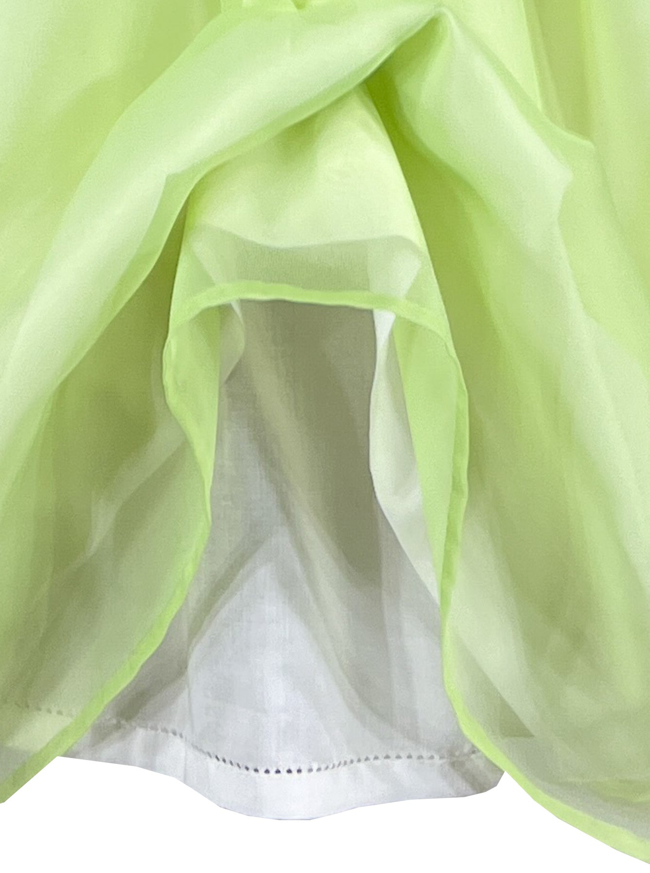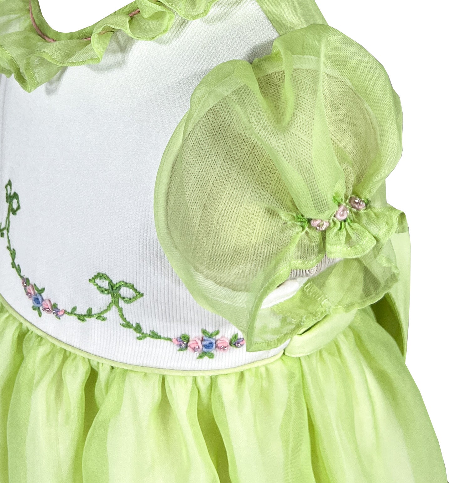 This precious Disney-inspired dress captures the magic and elegance of Princess Tiana from The Princess and the Frog in every exquisite detail. Crafted in sheer green organza to mirror the bayou's mystical charm, this dress whispers fairytales of dreams coming true and wishes upon evening stars.