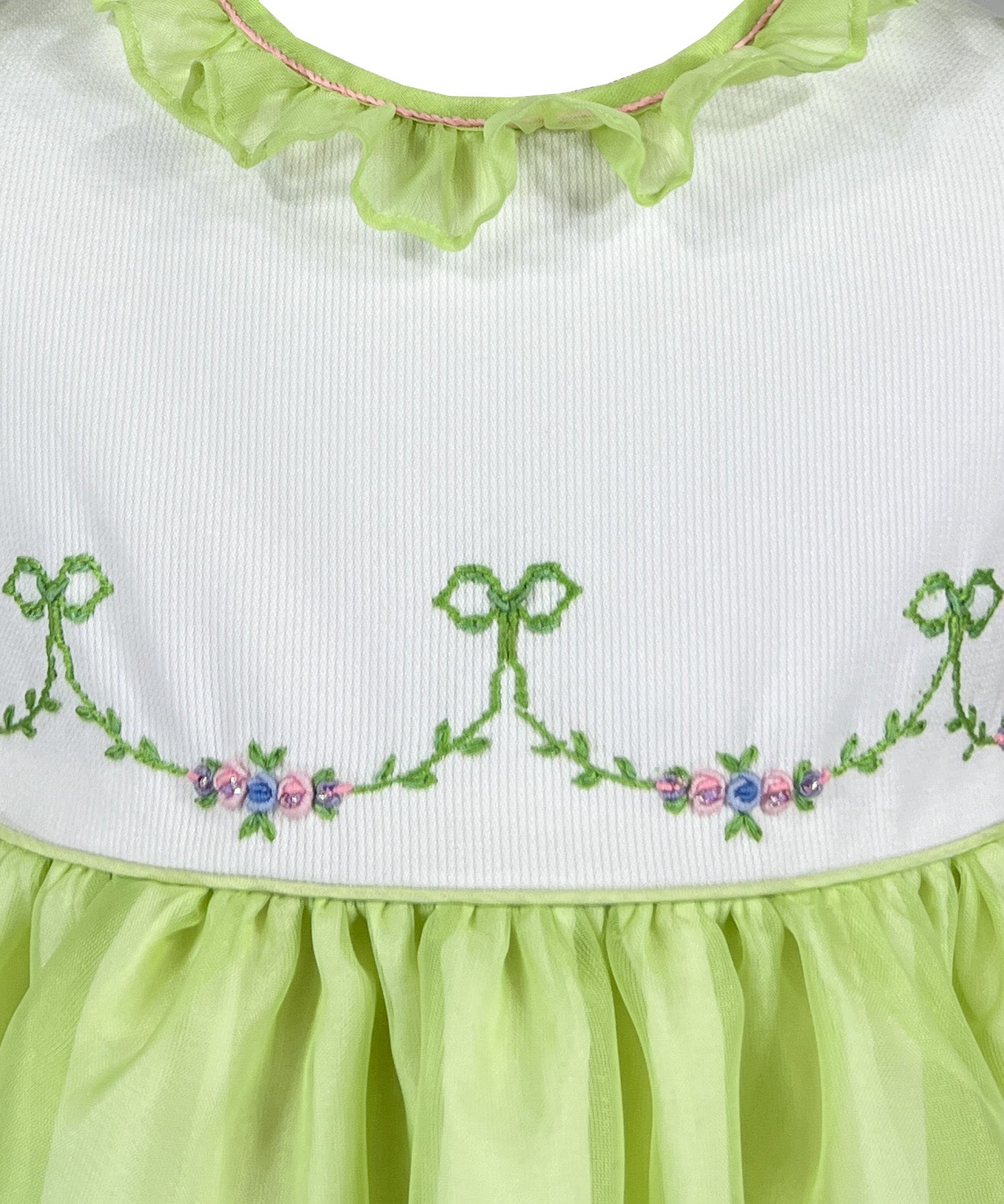 The white cotton piqué bodice features gorgeous bow and pearl embroideries that sparkle like dewdrops in moonlight, while the wide frilled collar frames the neckline like lily pads on tranquil waters. The puffed sleeves gathered at the cuffs with delicate pearl accents add royal sophistication. Self-covered buttons and our signature butterfly bow at the back ensure a perfect princess silhouette.
