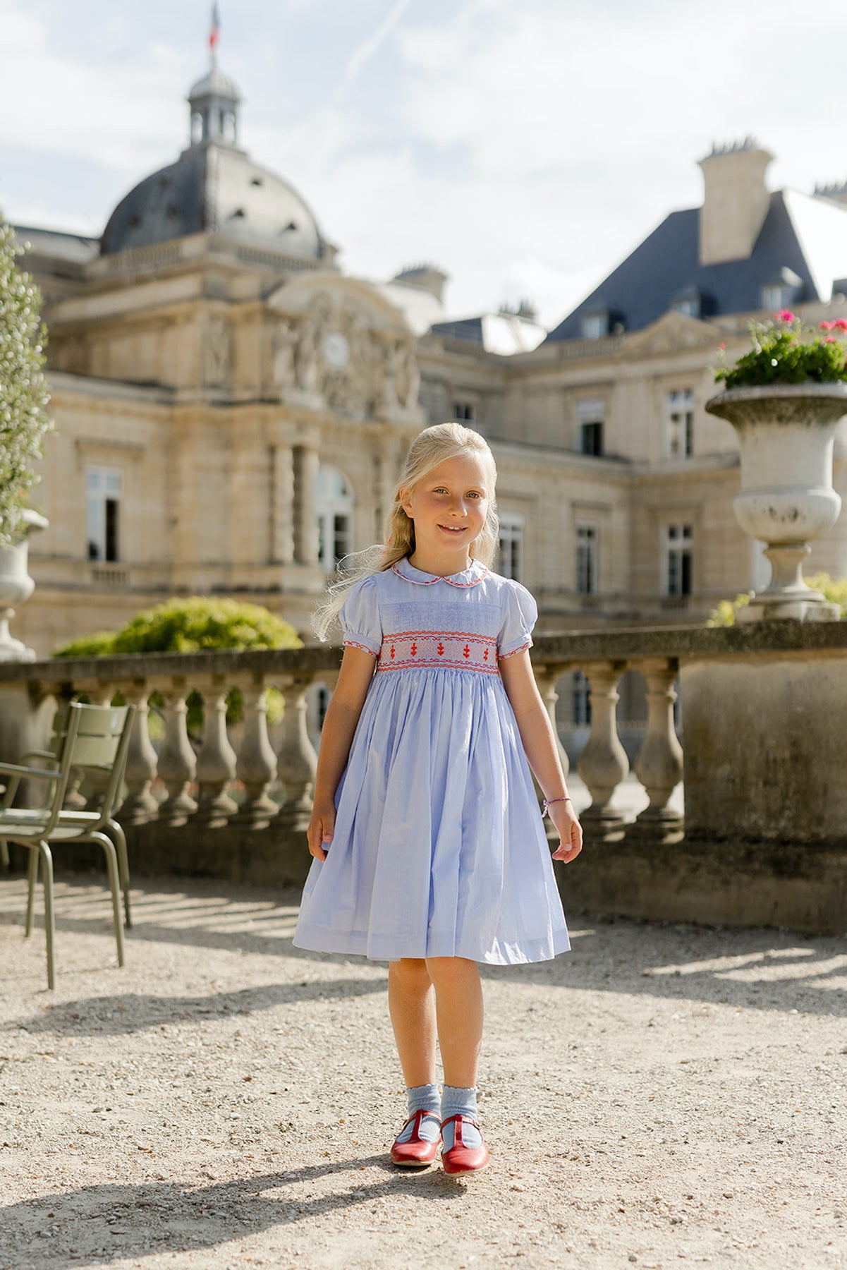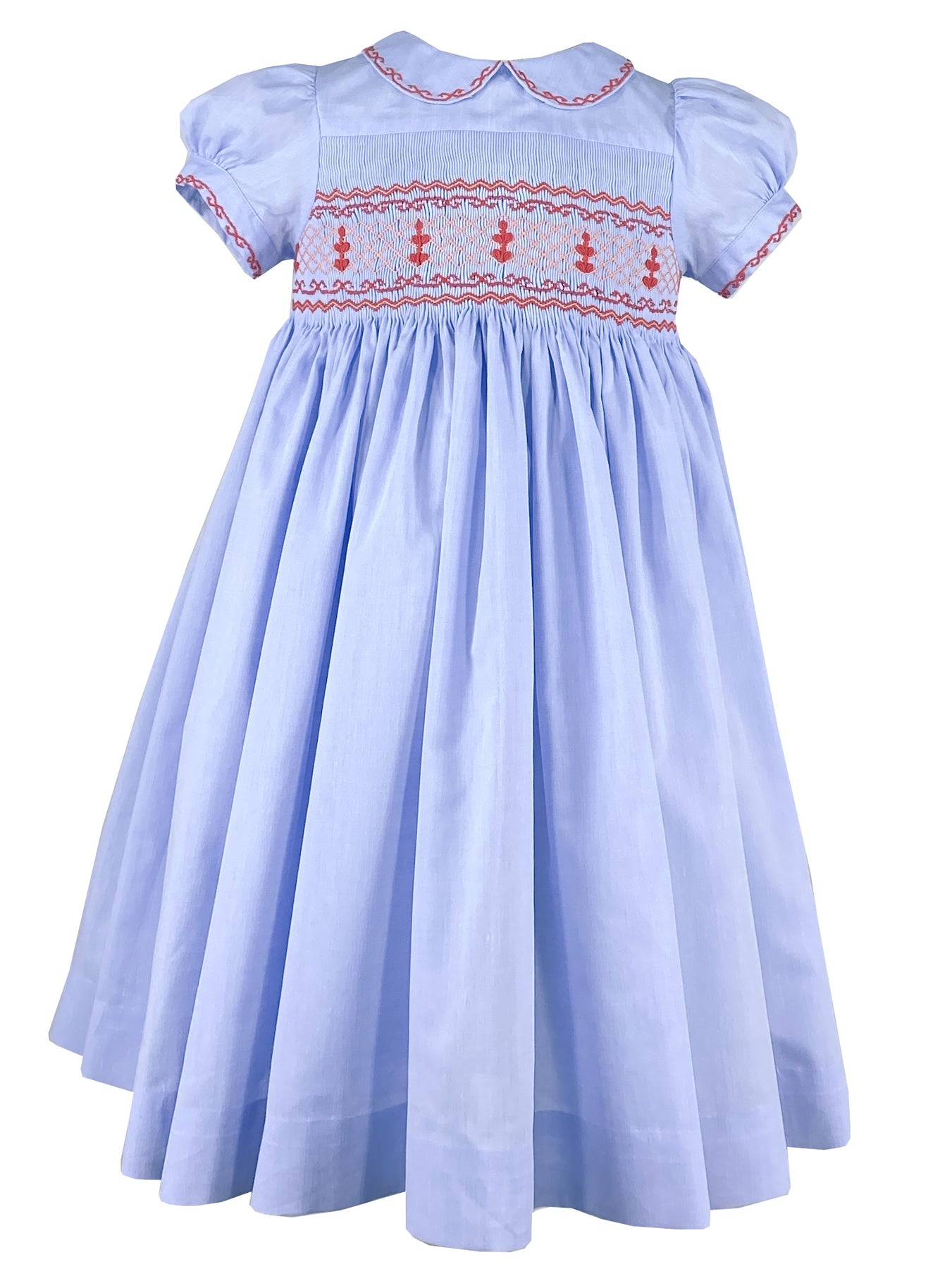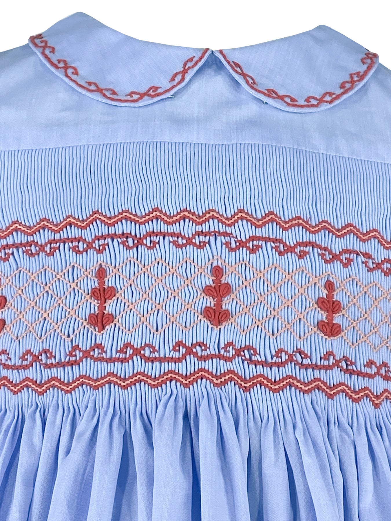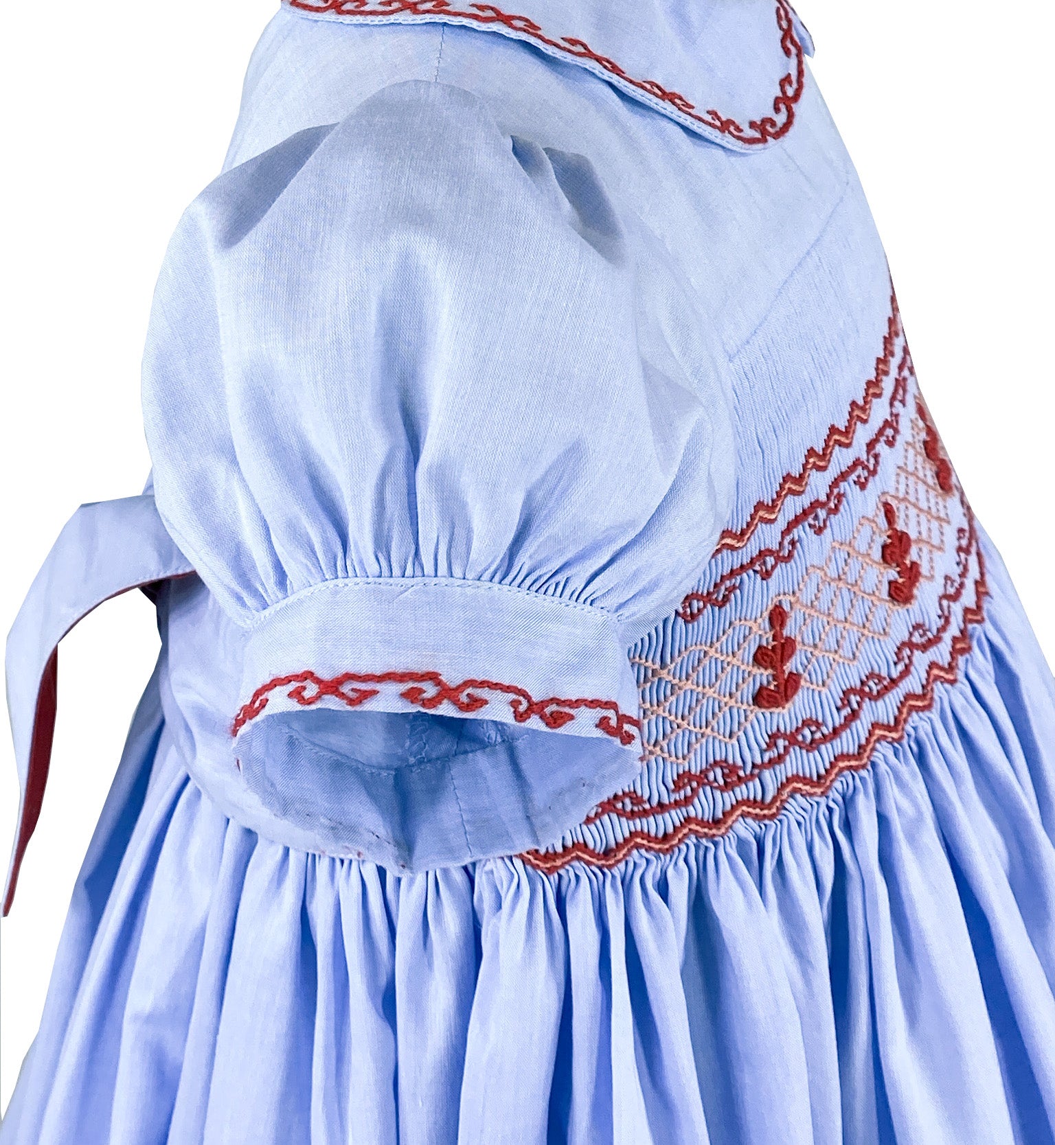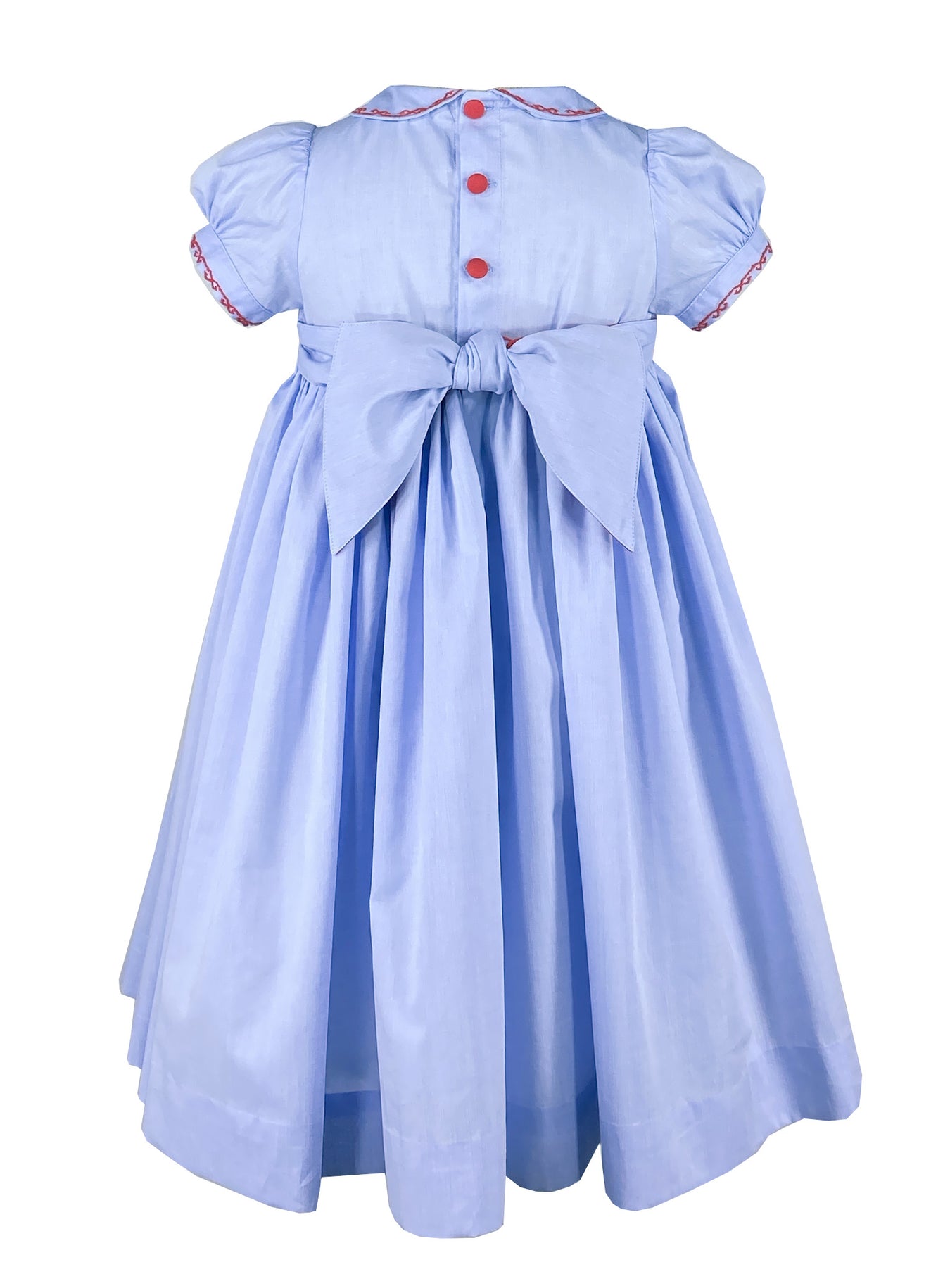 Beautifully handmade lavender blue smocked dress. This elegant design features puffed sleeves and a Peter Pan collar both adorned with elegant color embroidery highlighting the smocking across the bodice. It is perfectly finished with a butterfly bow in the back.