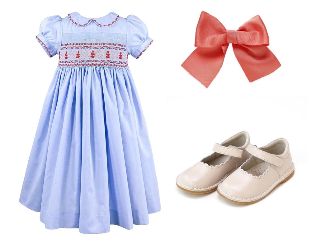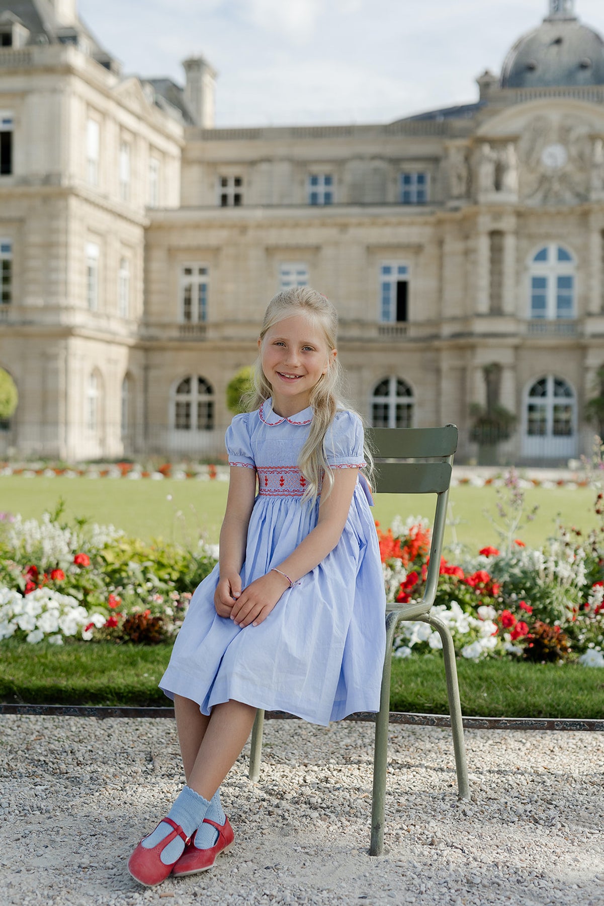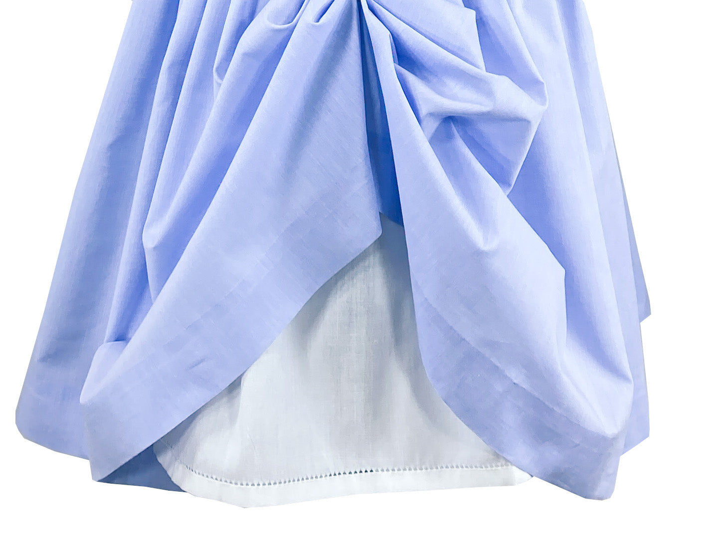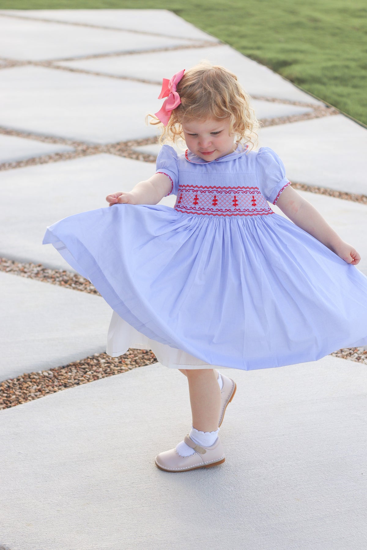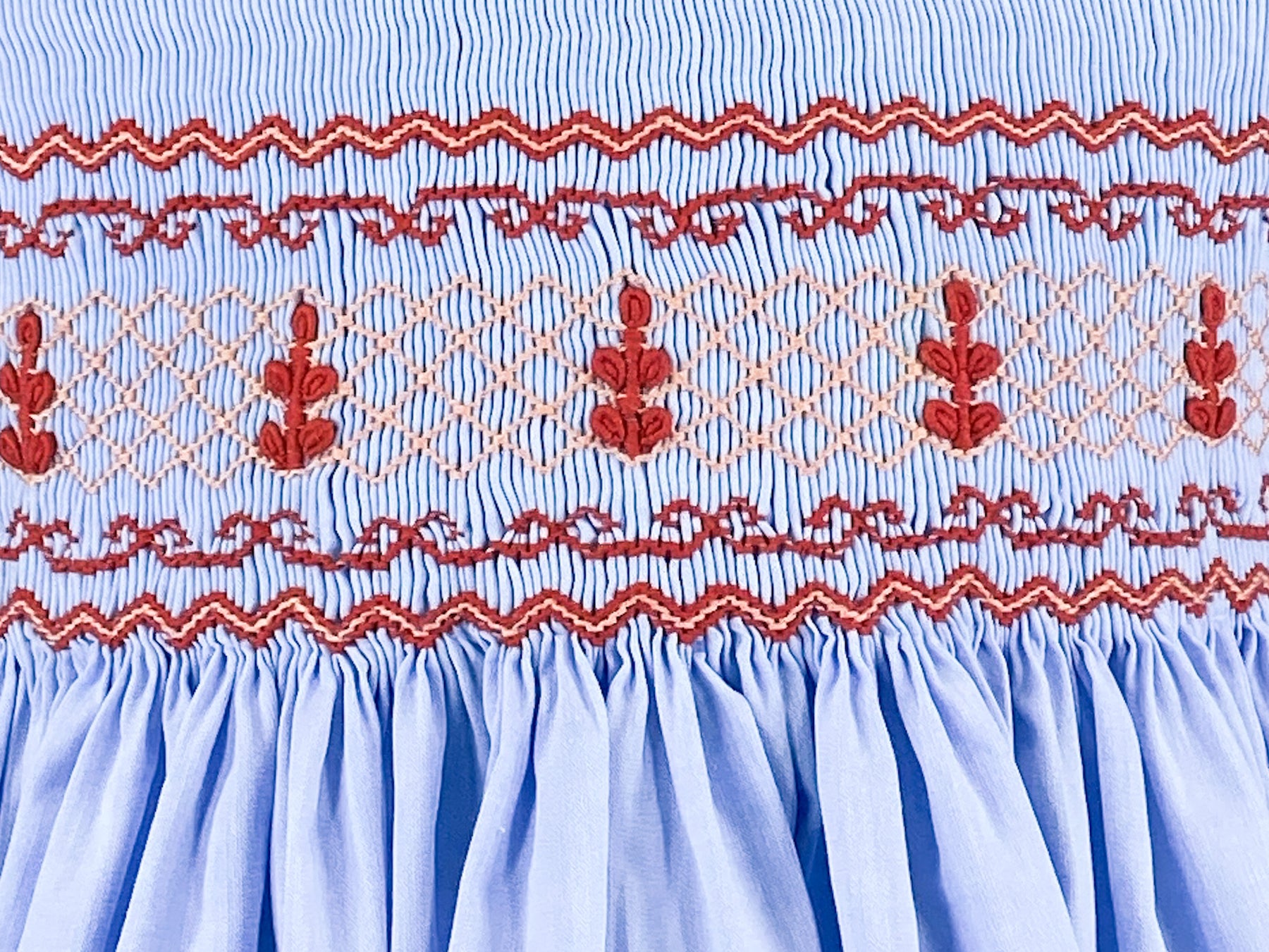 Beautifully handmade lavender blue smocked dress. This elegant design features puffed sleeves and a Peter Pan collar both adorned with elegant color embroidery highlighting the smocking across the bodice. It is perfectly finished with a butterfly bow in the back.