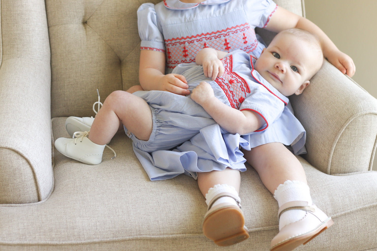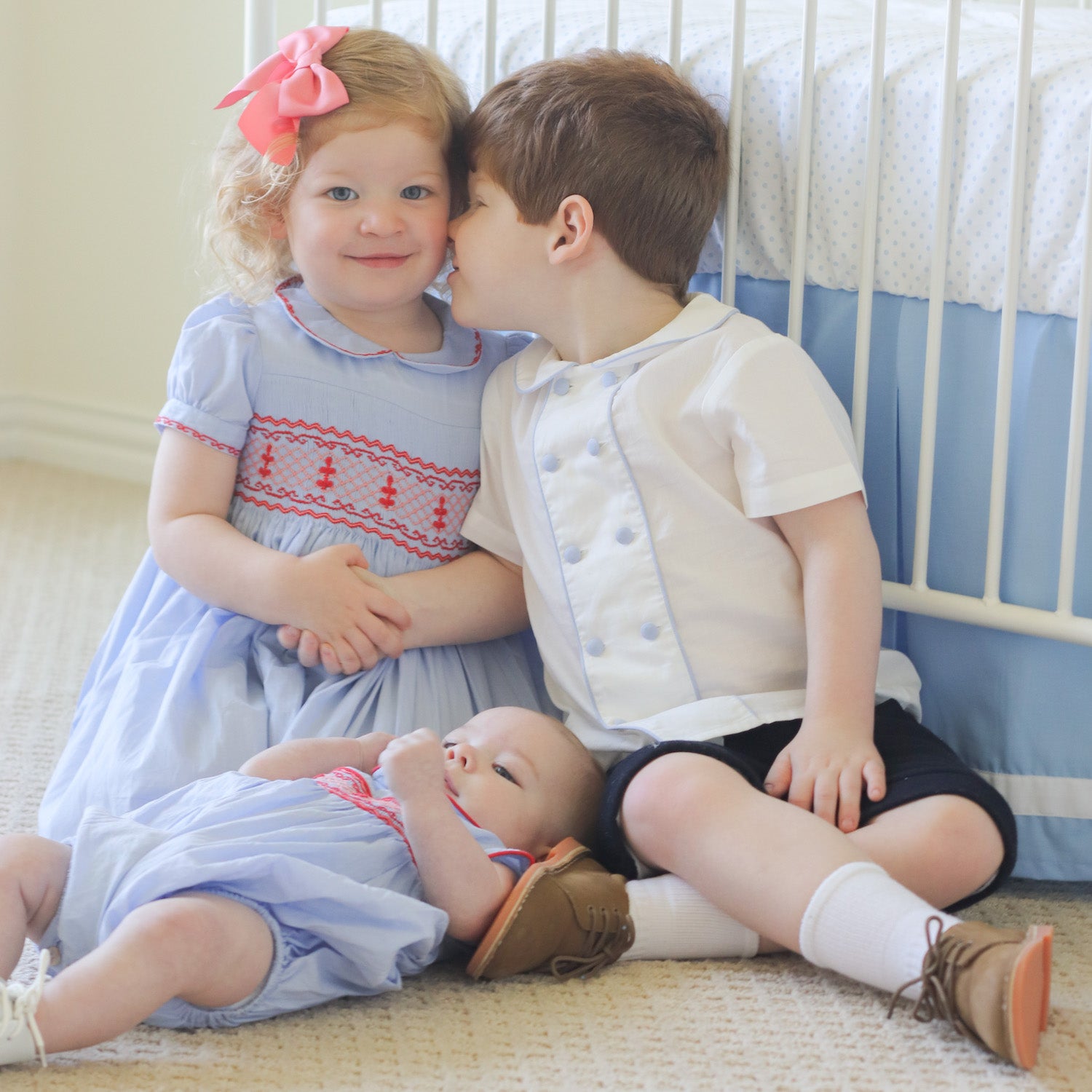Boys Matching outfits : Inspired by the British royal family, we have created matching outfits for your little princes : a baby boy smocked bubble for little ones and a double breasted Peter Pan collar shirt for older boys. A traditional heritage style for all the family. A classic look for family photos and heirloom portraits.