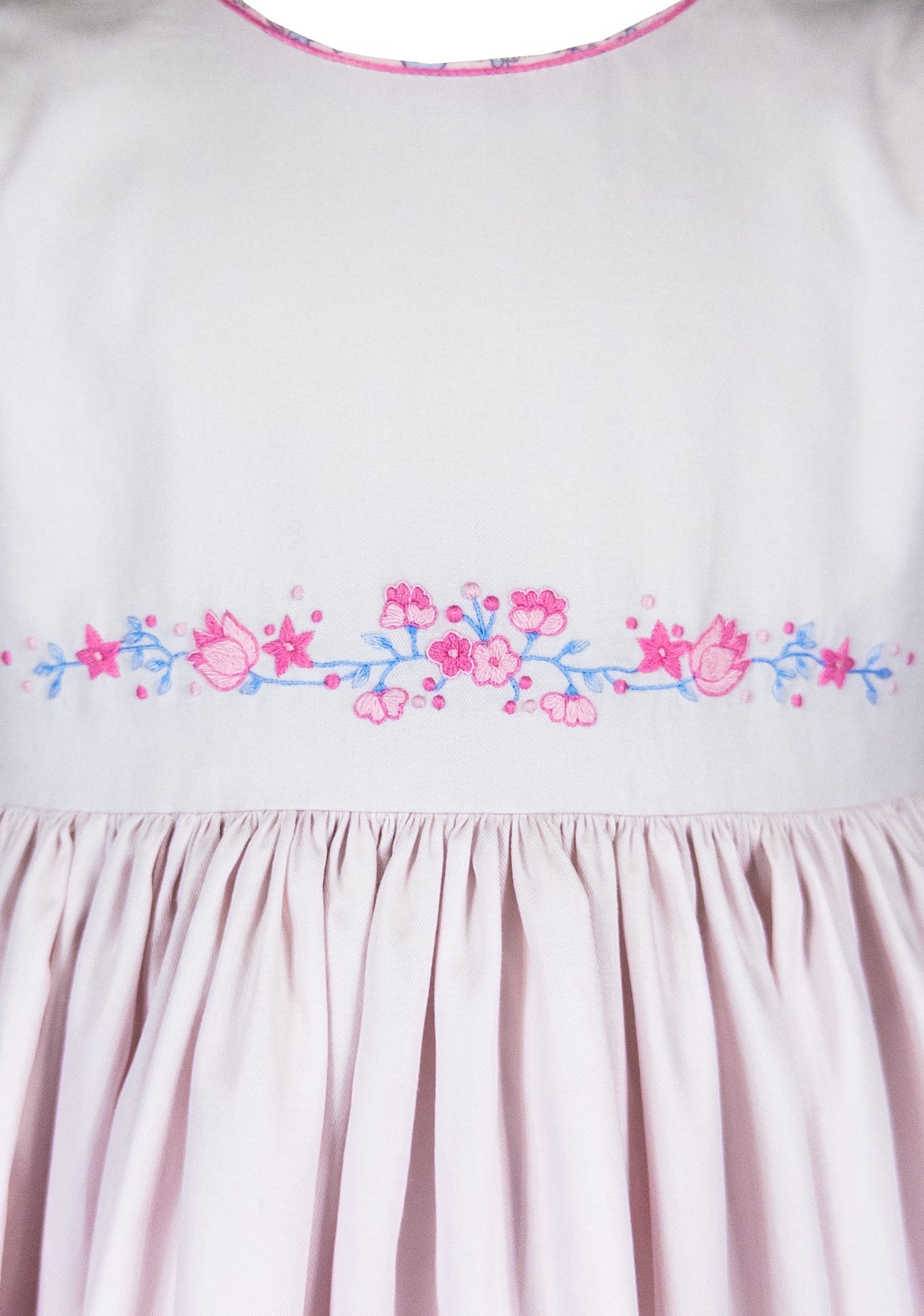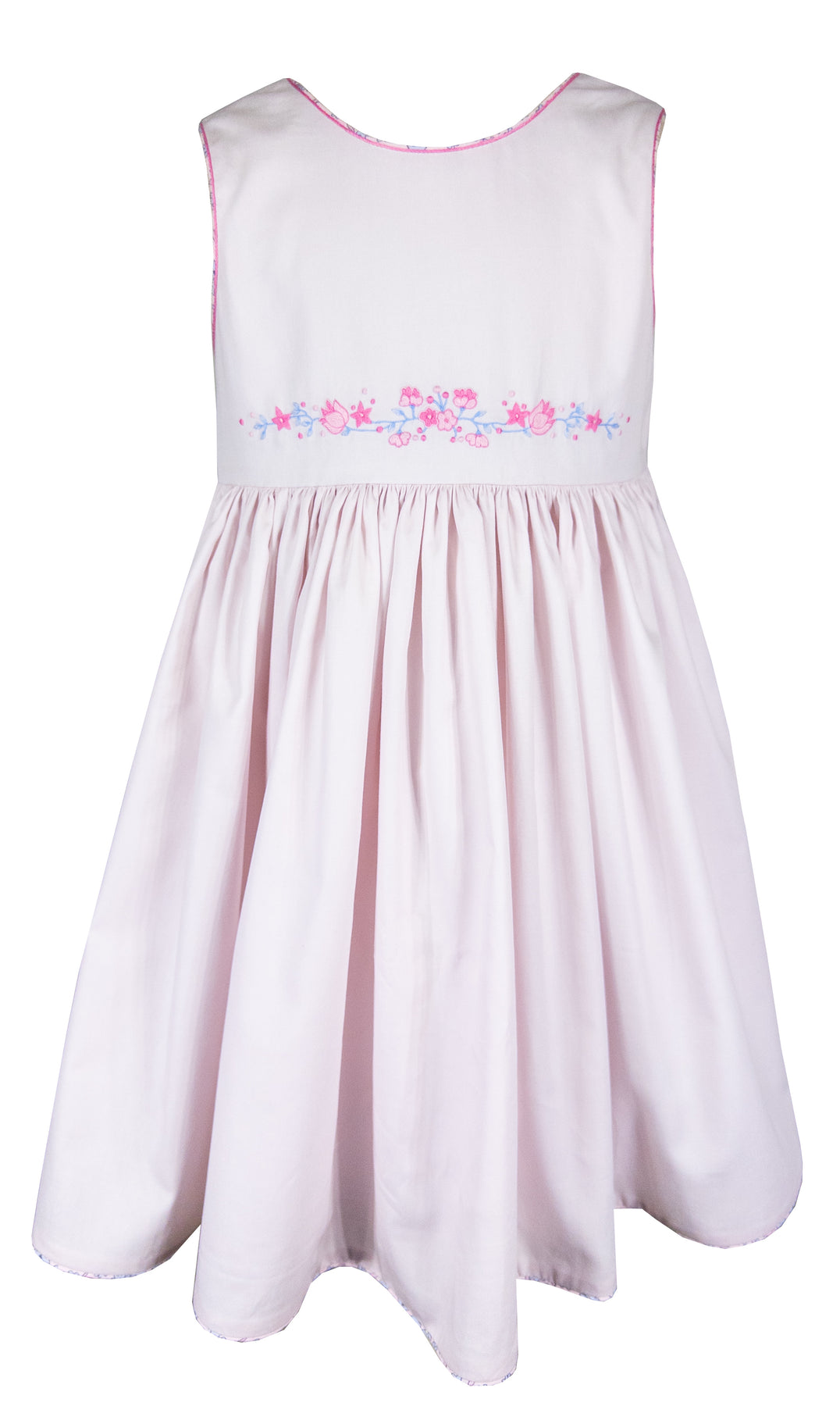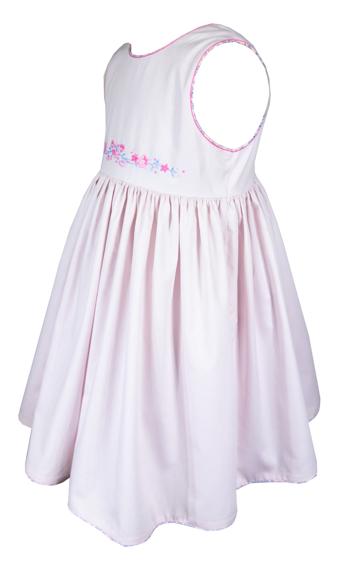 This sweet sleeveless pale pink dress whispers of enchanted gardens in gentle bloom. The chest features delicate hand-embroidered floral motifs in shades of rose and cornflower blue, creating a whimsical garland that dances above the waistline. The tender pink fabric flows into a gracefully gathered skirt, perfect for twirling through meadows of imagination.