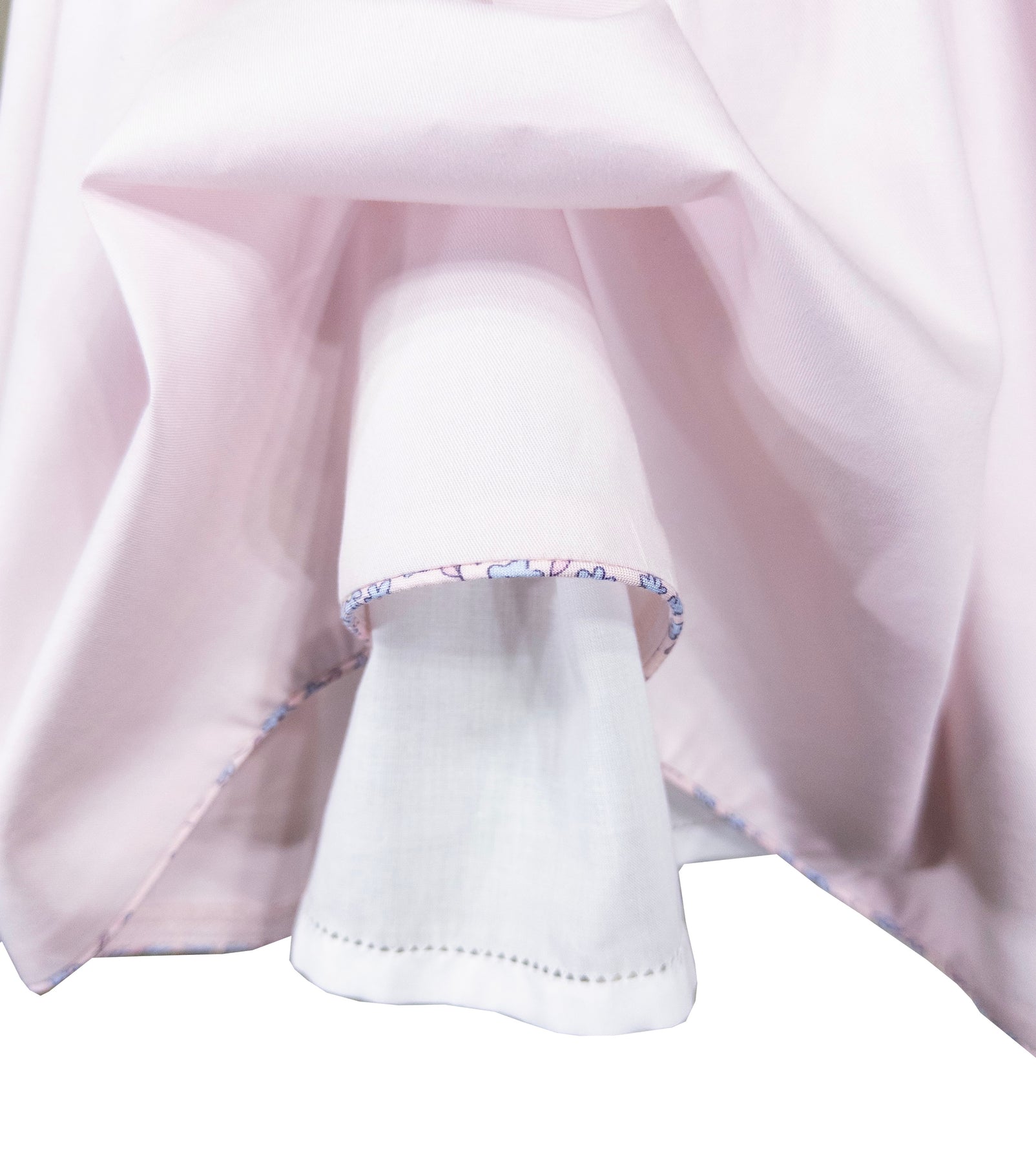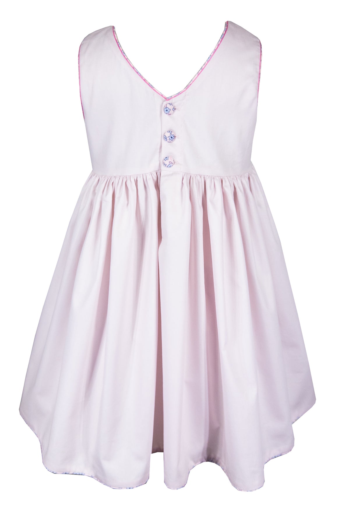 A charming floral print trim echoing the embroidery on the front frames the neckline, armholes and hem with elegance. This same flower pattern is used for the three self covered buttons gracing the V-shaped back of the dress. A thin bright pink thread around the neck and arms adds a subtle chic finishing touch.