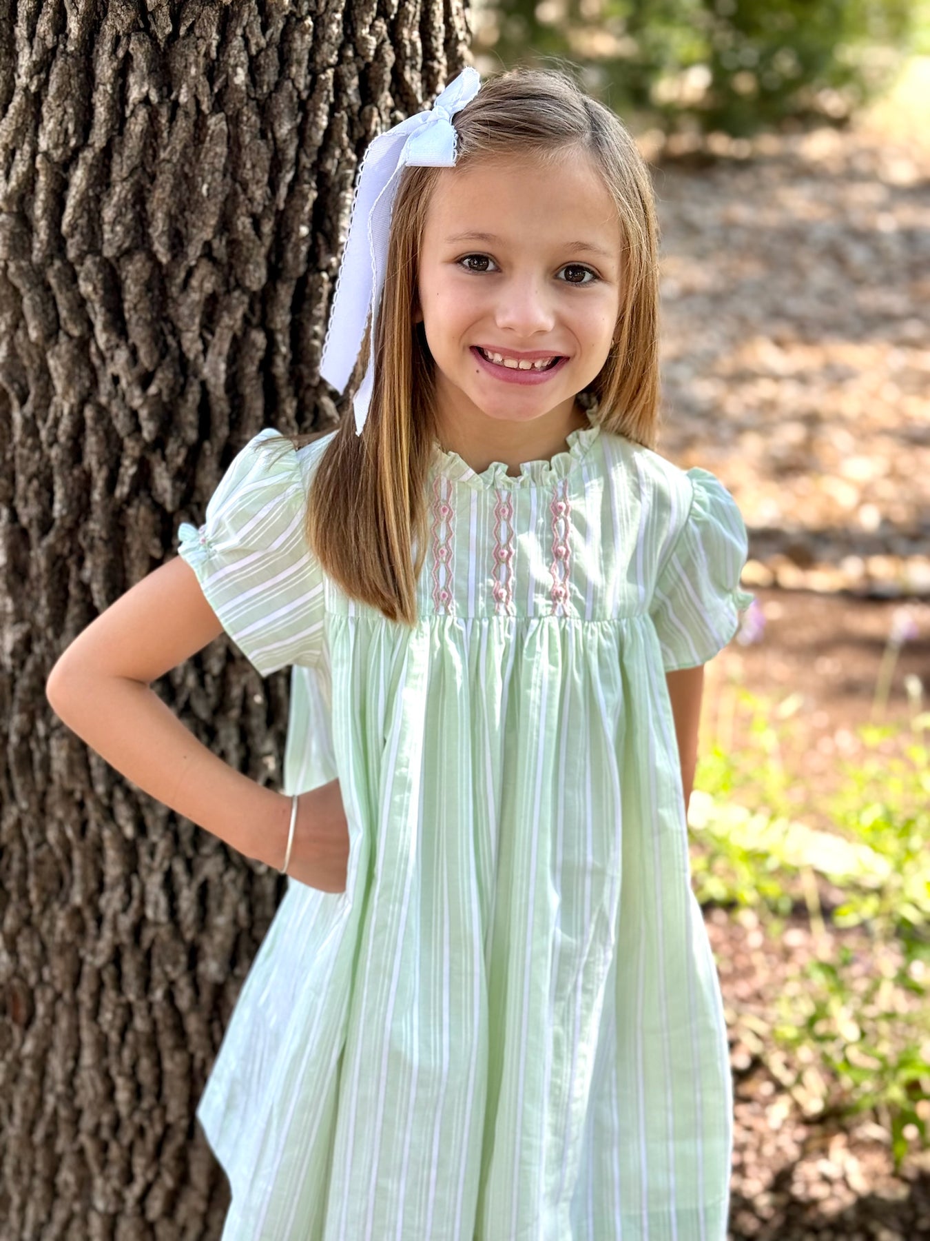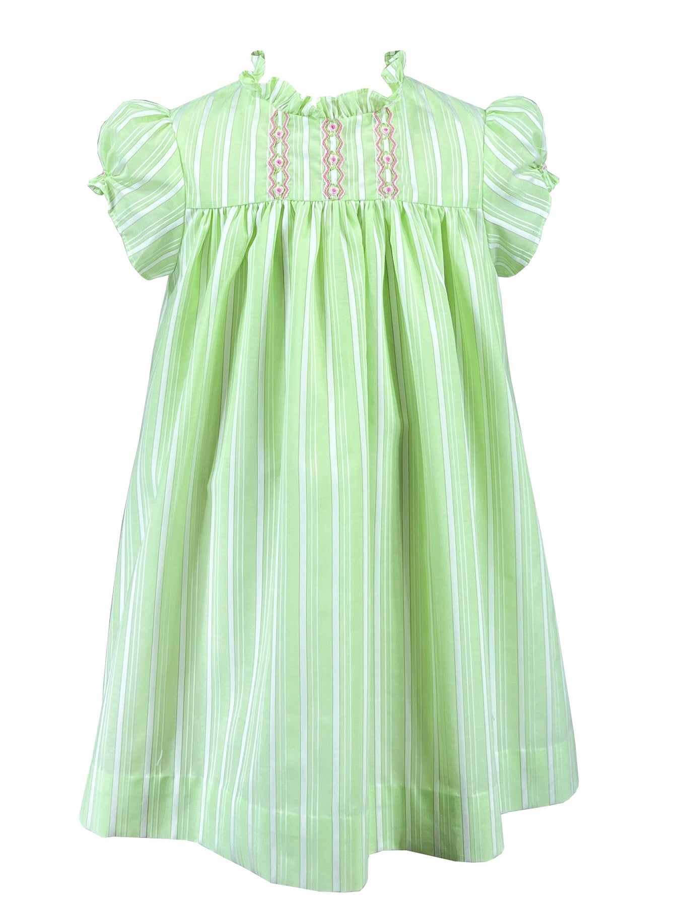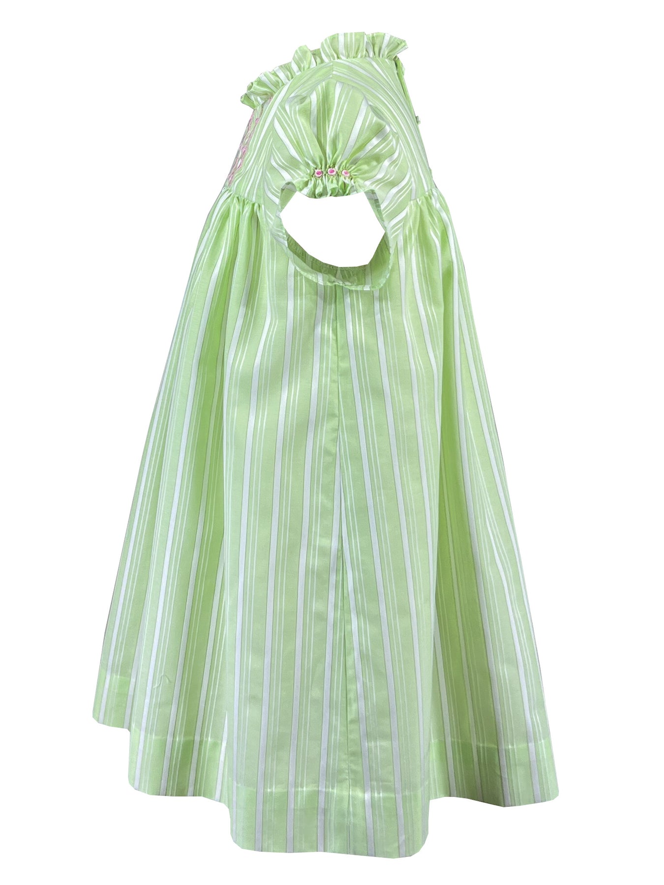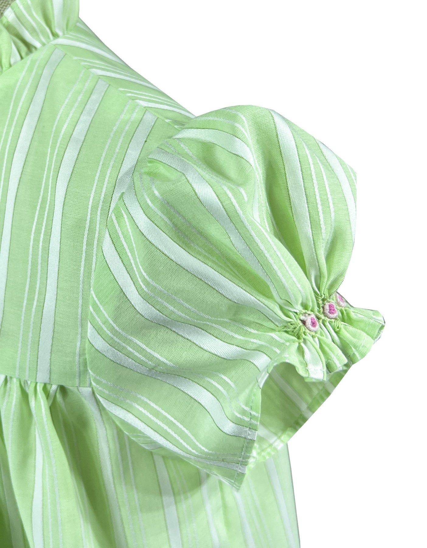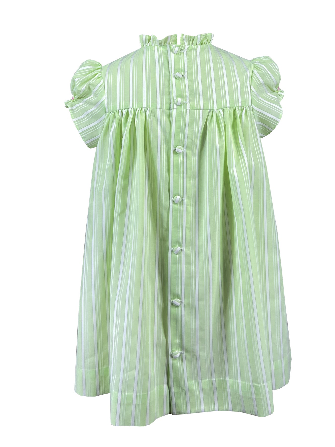 Sweet apple green striped summer dress for little girls. With short puffed sleeves and a stand-up frilled collar, it is the perfect look for chic day wear.