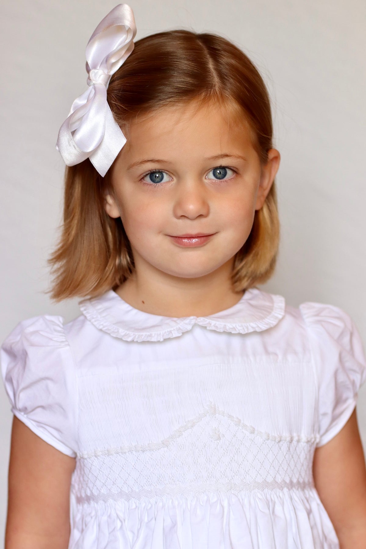 white heirloom smocked dress, child portraiture dress, classic white peter pan collar dress