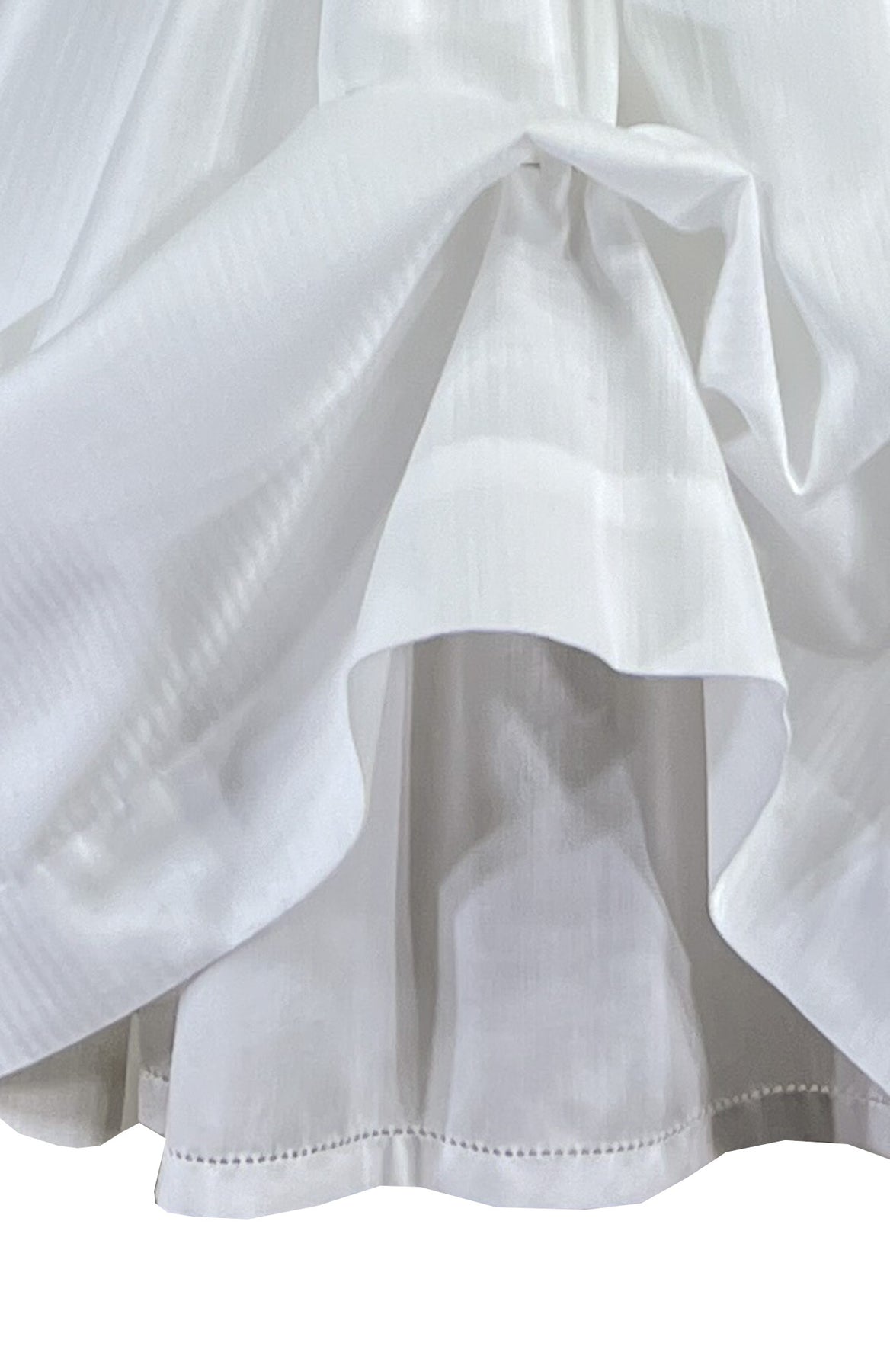 Our beautiful traditional white heirloom smocked dress features a classic Peter Pan collar trimmed with frills, delicately puffed short sleeves with piping, elegant fabric-covered button fastening, and a charming butterfly wing sash that ties gracefully at the back. The thoughtfully designed underlayer adds volume to the skirt, creating a poetic, full silhouette.