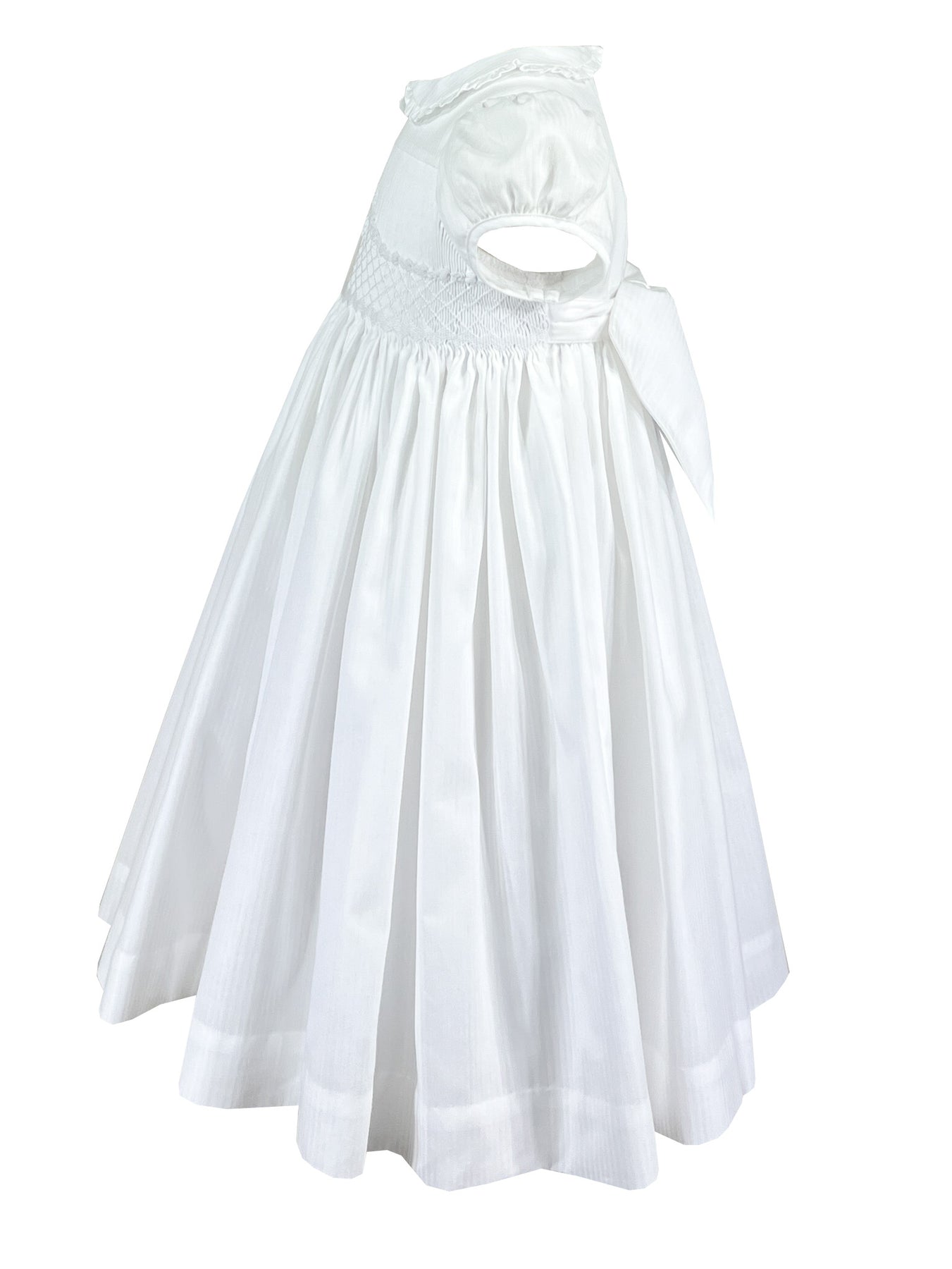 This timeless heirloom piece is distinguished by its intricate hand-smocked tiara pattern across the bodice. The tone-on-tone embroidery offers subtle sophistication that elevates this classic design to an exceptional keepsake garment.