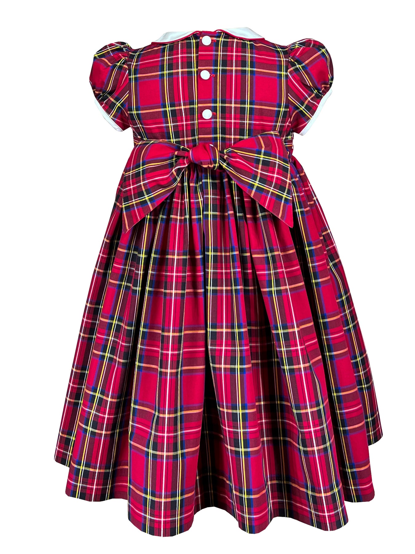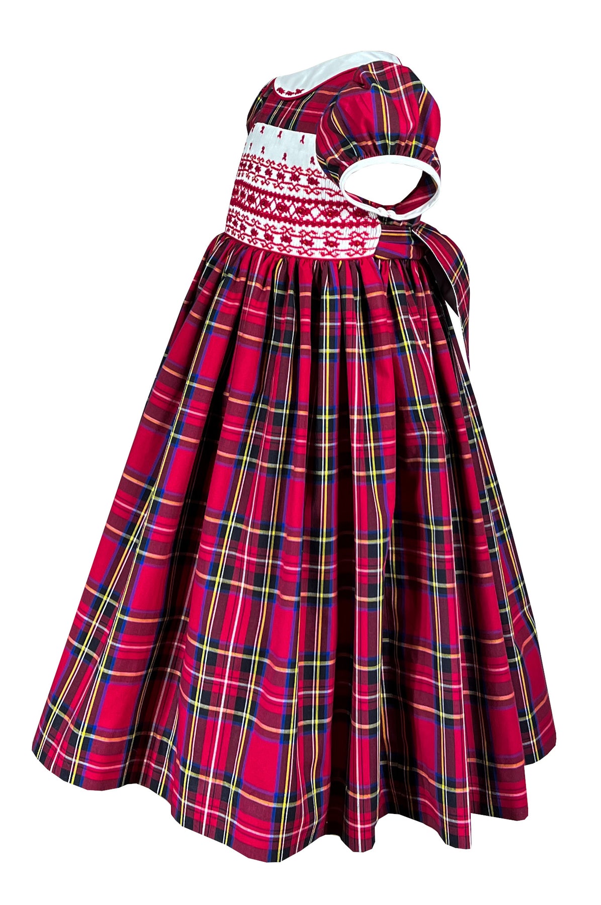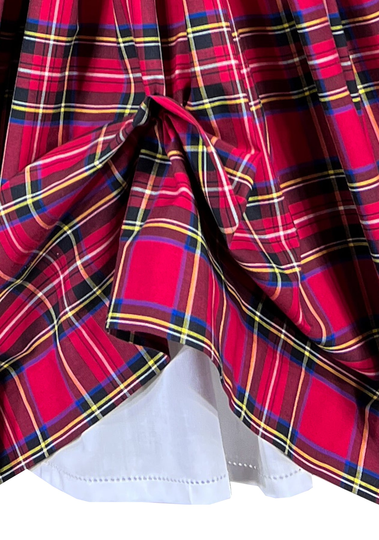 This sumptuous Christmas dress captures the grandeur of the holiday season in rich Royal Stewart tartan weaving together crimson red with whispers of navy blue, white and hints of yellow which shimmer like winter starlight.