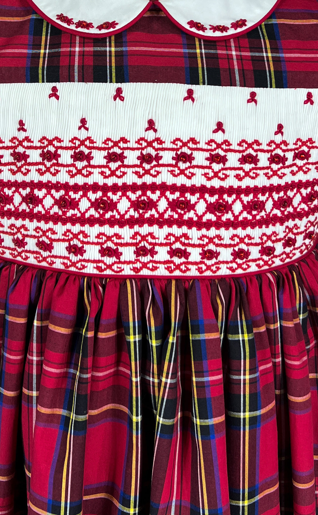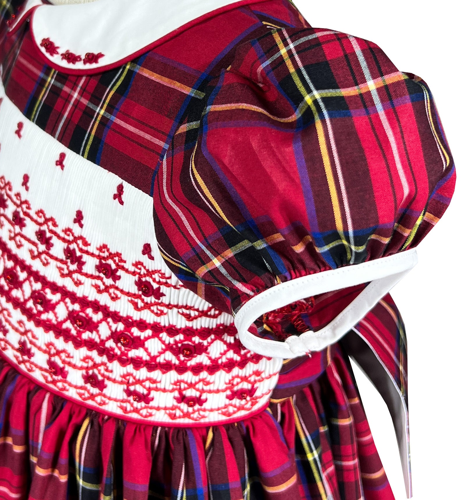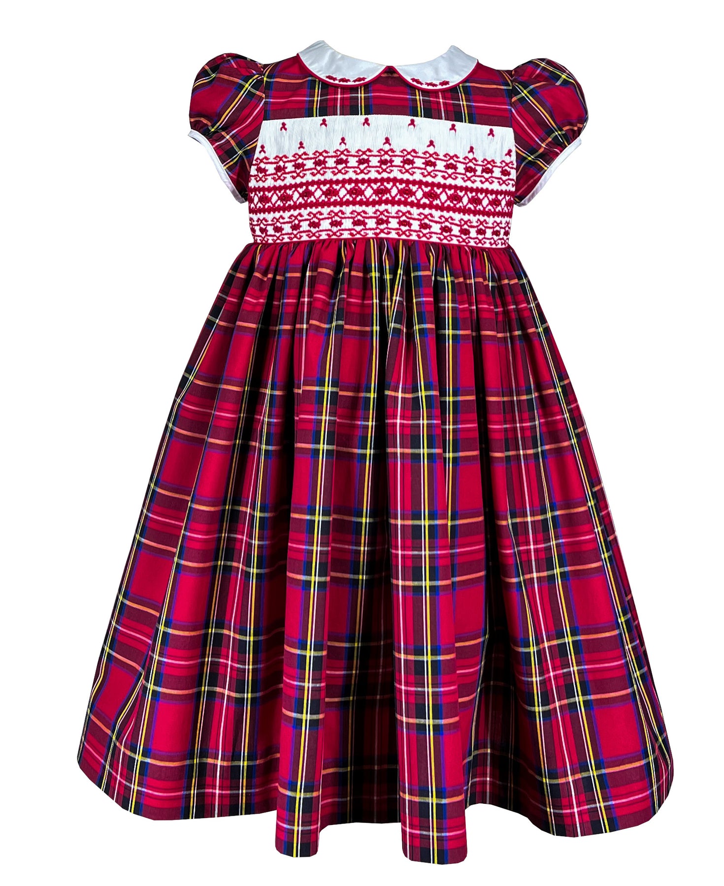 This sumptuous Christmas dress captures the grandeur of the holiday season in rich Royal Stewart tartan weaving together crimson red with whispers of navy blue, white and hints of yellow which shimmer like winter starlight.