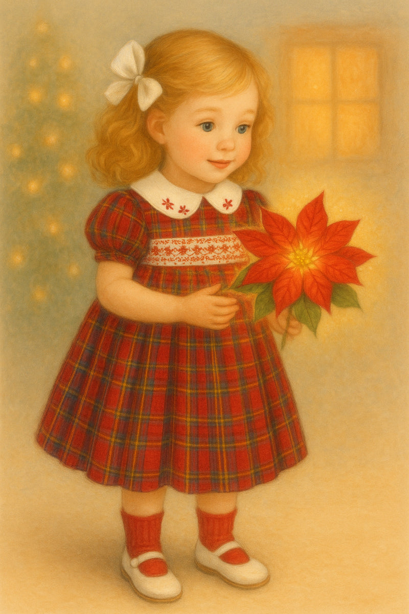 "Once upon a Christmas, a little girl discovered that each red poinsettia held a different memory from years gone by. As she touched the magnificent flowers, they began shining like jewels and in their petals she caught glimpses of homes filled with tartan ribbon decor and snowy winter wonderlands.