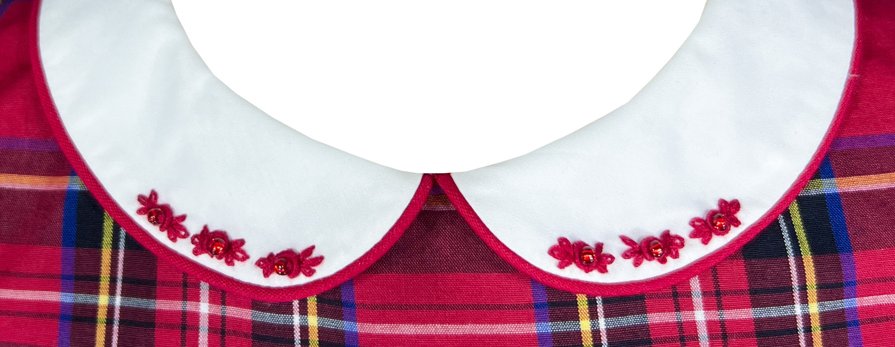 A crisp white Peter Pan collar with matching poinsettia embroidery and red trim frames the neckline with timeless elegance. Classic puffed sleeves with white piping, self-covered buttons, and a delicate butterfly sash at the back complete the silhouette with refined grace.